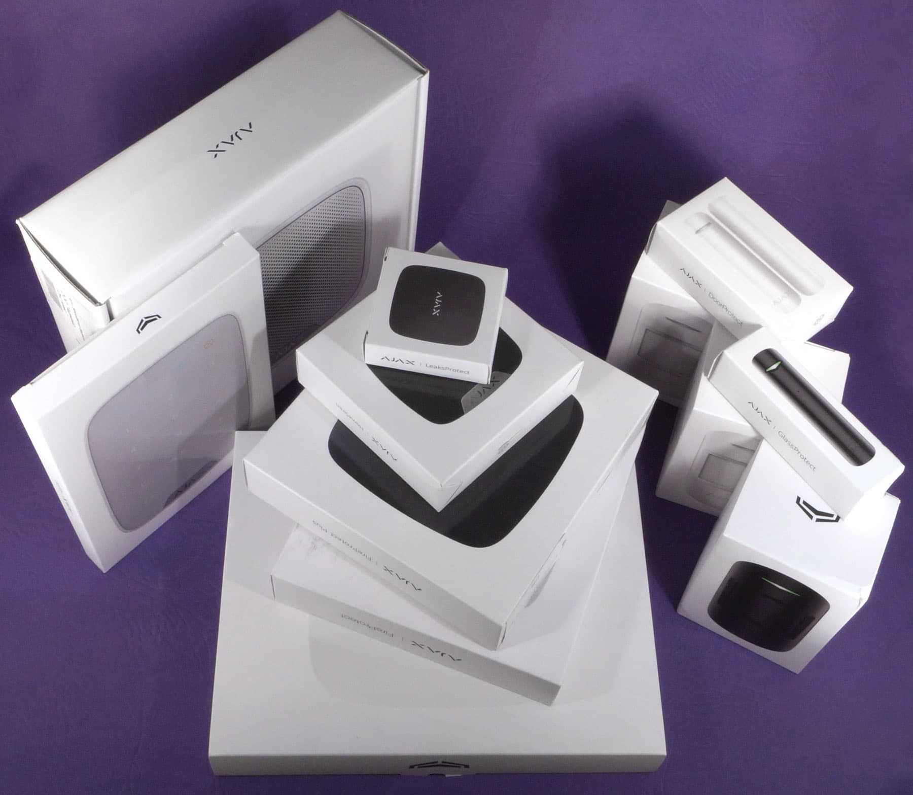 Основу беспроводной системы безопасности Ajax составляет центральный блок — хаб. Сам по себе он уже является системой, которая готова к работе и может динамически расширяться и видоизменяться за счет подключаемых дополнительных датчиков. А их, датчиков — солидный выбор. Для тестирования нам был предоставлен комплект, состоящий из 12 разных устройств. Будучи в упаковке, все они с трудом поместились в кадре.