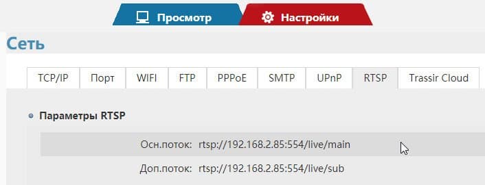Эта камера интегрирована с облачным сервисом видеонаблюдения Trassir Cloud, который позволяет просматривать видеопотоки с совместимых камер и даже хранить месячный архив записей, а для управления всем этим хозяйством используется либо браузер, либо мобильное приложение Trassir Client. Однако это облачное предназначение совсем не мешает камере в реальном времени транслировать видеопоток еще и по стандартному протоколу RTSP. Ссылка на него в явном виде указана непосредственно на веб-страничке камеры. Даже две ссылки: первая для основного видеопотока (высокого разрешения) и для дополнительного потока (малого разрешения).