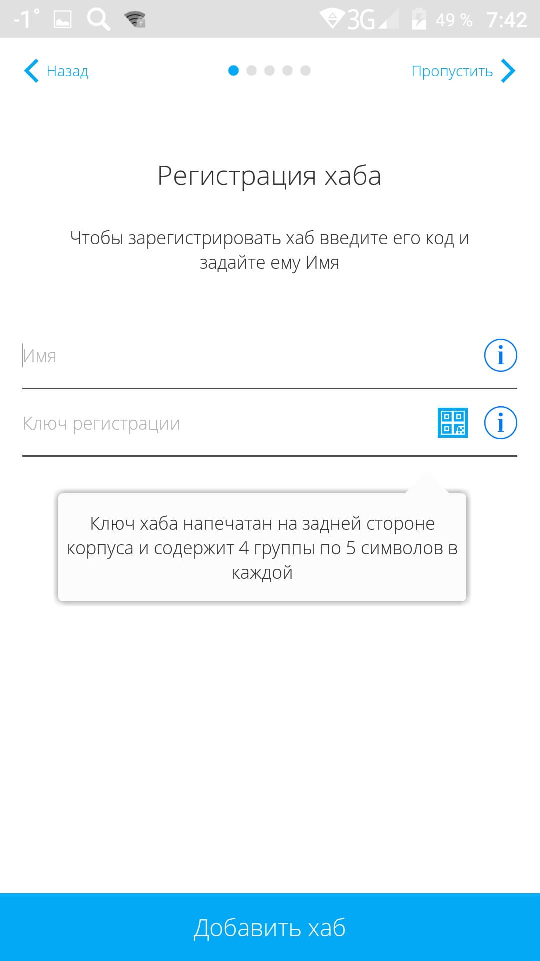 | Включение | Индикатор светится синим, пока нажата кнопка включения | Производится загрузка хаба |