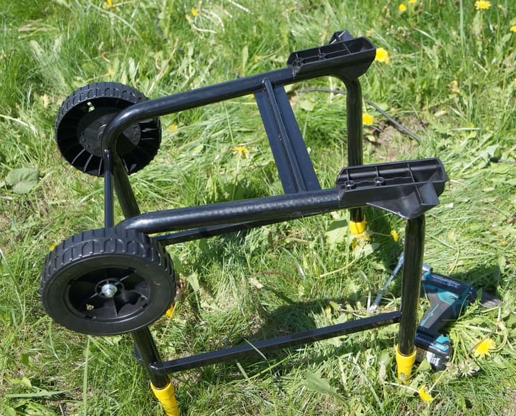 В первую очередь нужно вставить в раму подставки колесную ось, закрепить на ней колеса и привинтить ножки-подставки. Затем водрузить на эту раму основной блок с надетой воронкой, и зафиксировать его четырьмя болтами. Все, машина готова к транспортировке. Два больших колеса здорово облегчают эту задачу: таскать на руках 25 килограммов совсем не вариант. Да и немаленькая она получается в собранном виде. 185-сантиметровому автору аж по пояс.