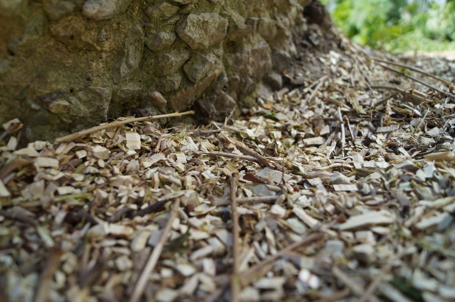 Куда бы ее теперь девать, эту стружку с мелкими веточками? Кто-то заполнит этим материалом компостную яму. И правильно сделает. Но правильно — не значит интересно. Мы вот обсыпали стружкой каменную ретро-клумбу, вокруг, по периметру.