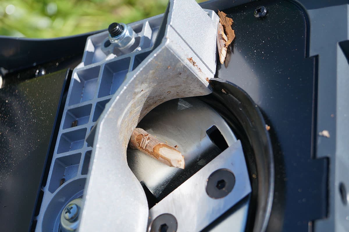 В этом коротком ролике была показана вторая ошибка пользователя: нельзя выключать машину, пока ножи не обработали последний загруженный в воронку прутик. Это определяется на слух. Если двигатель выключить, пока часть даже нетолстой ветки болтается внутри, этот необработанный материал с высокой долей вероятности затянется в зазор между диском и опорной (отсекающей) пластиной и заблокирует диск от последующего включения. Кстати, высота посадки этой пластины отрегулирована на заводе и менять ее не рекомендуется.