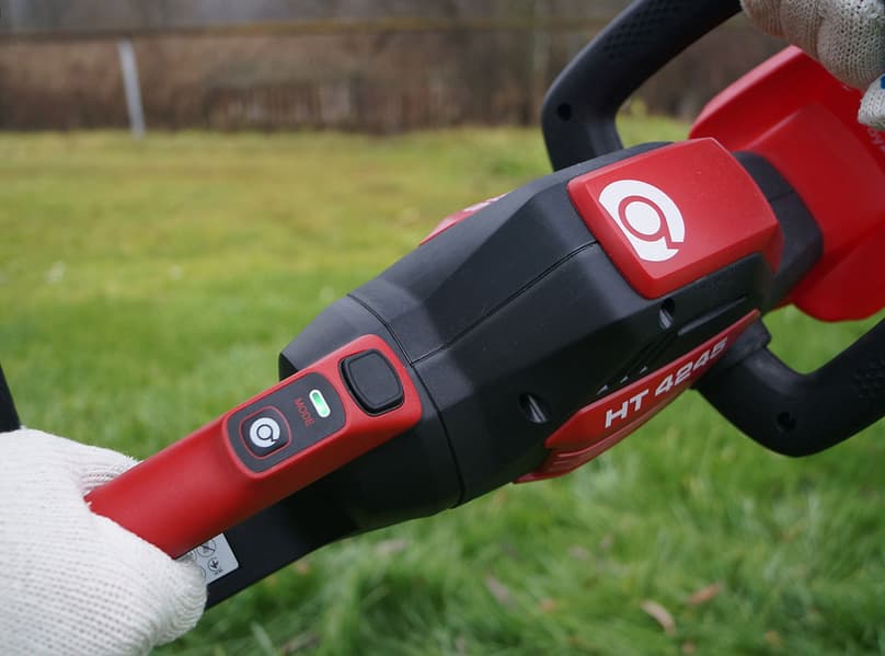 Все управление кусторезом осуществляется двумя переключателями. Первый, играющий роль блокиратора, встроен в рукоять-дугу и активируется, стоит только за нее взяться. Второй орган управления — кнопка, которой включается двигатель. Повторное нажатие кнопки меняет скорость двигателя и, соответственно, возвратно-поступательного движения режущей зубчатой пластины. Кусторез может работать в двух режимах, Eco (1200 движений в минуту) и Power (1500 движений в минуту).