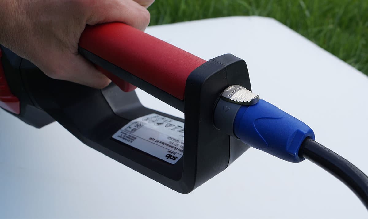 Питание кусторез получает через разъем, расположенный на торце поворотной рукояти. В этот разъем вставляется штекер кабеля, идущего от подвесной ременной системы с установленным аккумулятором.