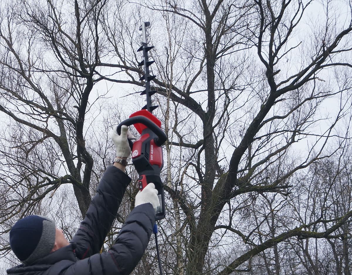 К сожалению, по не зависящим от нас причинам тестирование велось с имеющимися аккумуляторами серии Energy Flex, а не Power Flex. Это никак не сказывается на производительности кустореза, напряжение-то одинаково. Батареи разных серий отличаются только емкостью и конструкцией корпуса. Но система подачи питания — собственно кабель, идущий от чехла с батареей — одинакова. Так, длины полутораметрового кабеля, который тянется от подвешенной на пояс аккумуляторной сумки, хватит, чтобы вытянуть инструмент в любом направлении, на любую длину и высоту. Даже останется.