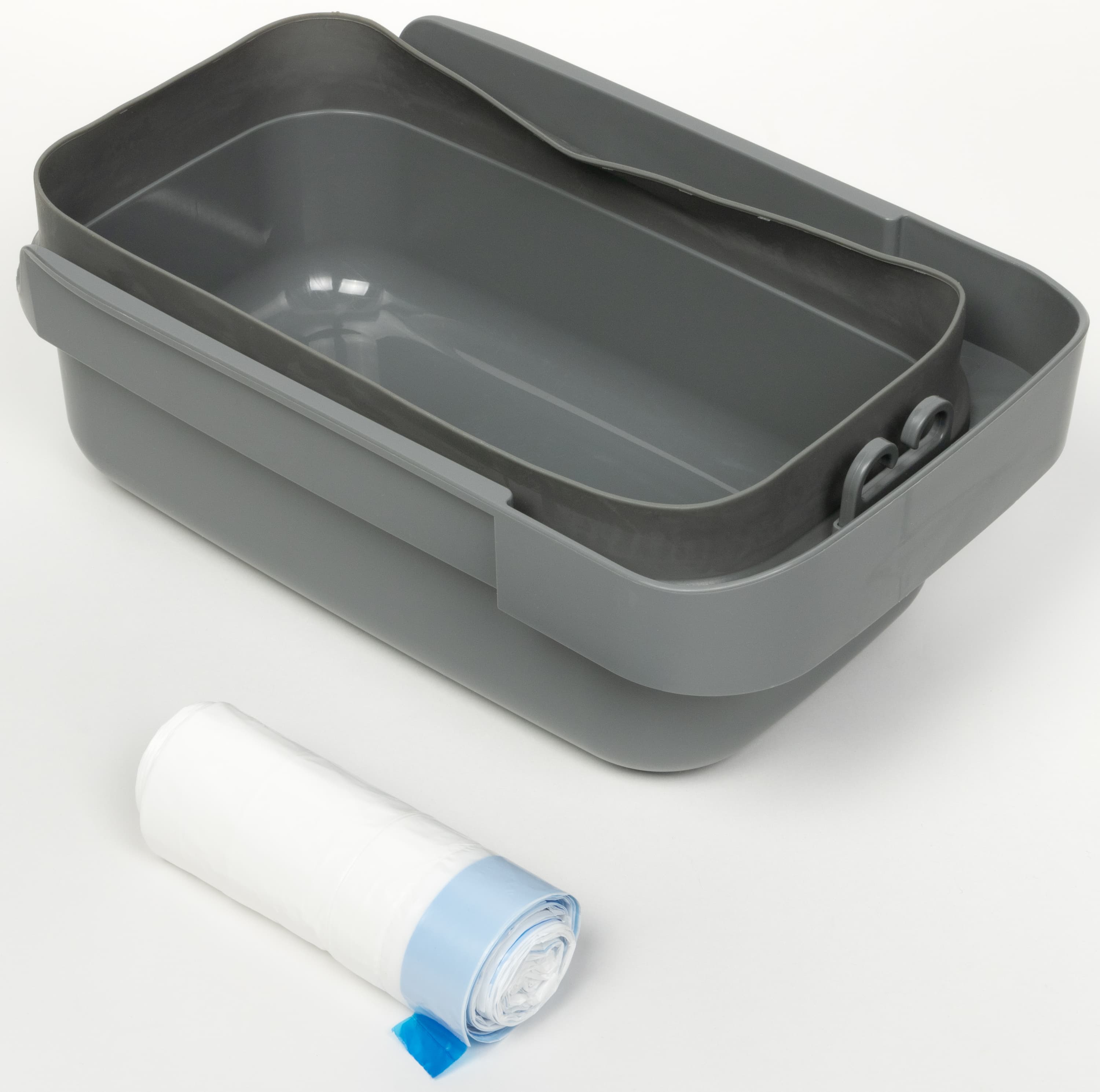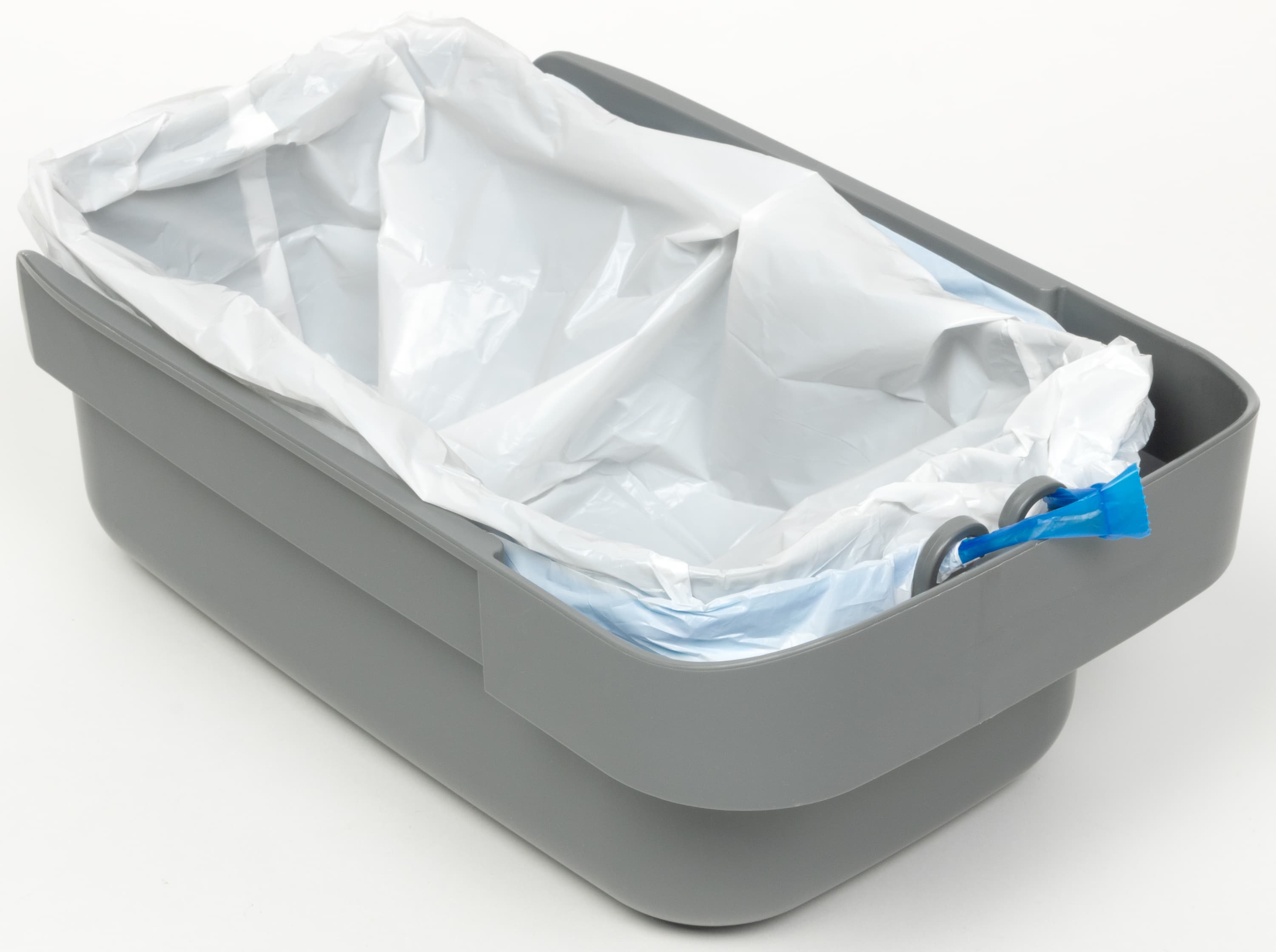 Далее, необходимо расправить один из мешков в лотке, и установить лоток на свое место под днищем корпуса. Это стандартный вариант для абсолютного большинства автоматических лотков такого типа. Смысл его заключается в том, что к отходам жизнедеятельности животных, попадающих в лоток, руками прикасаться не придется. Достаточно просто потянуть за лямку, стянуть горловину пакета, завязать ее, заперев таким образом все неприятные запахи внутри.
