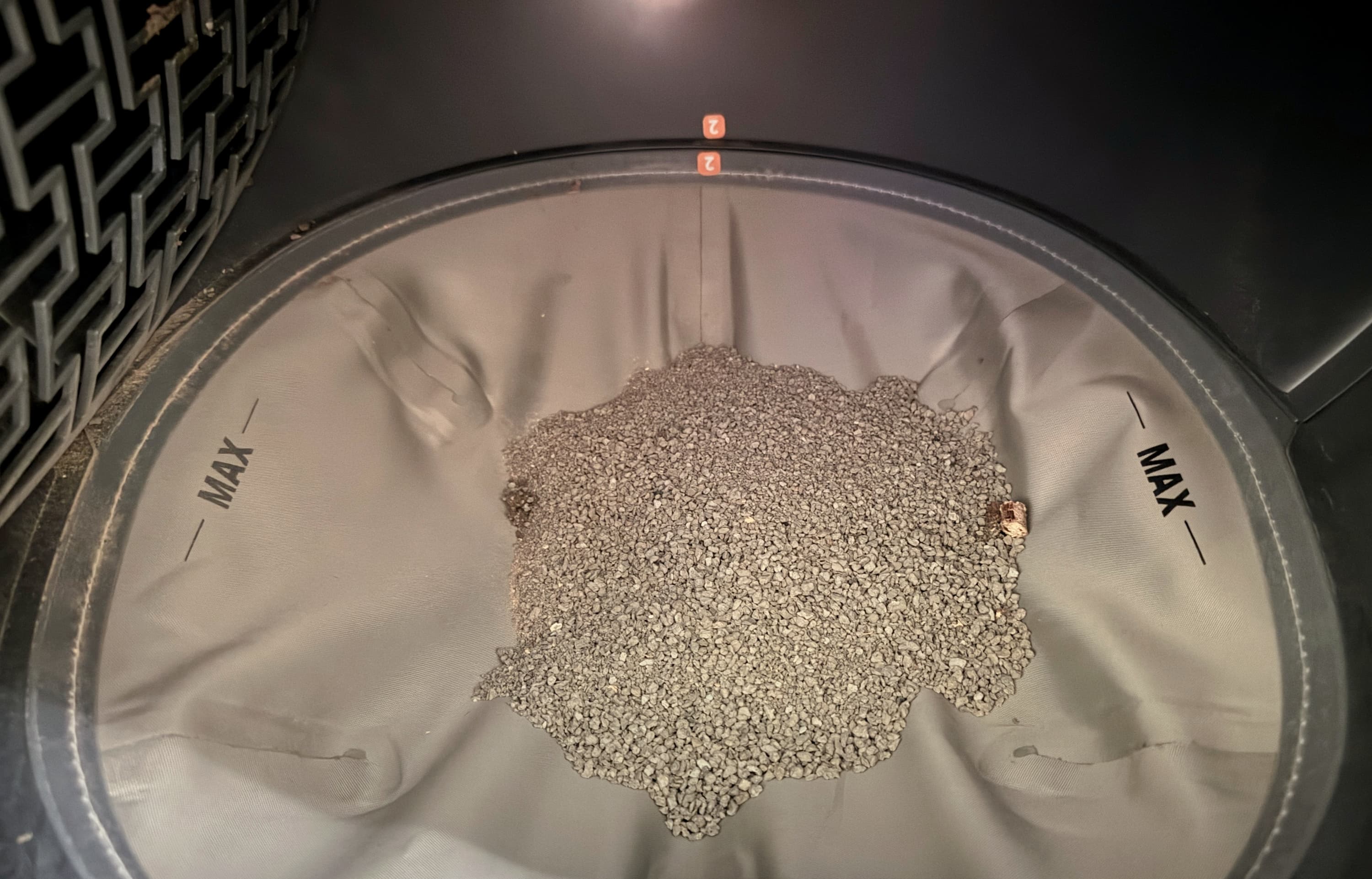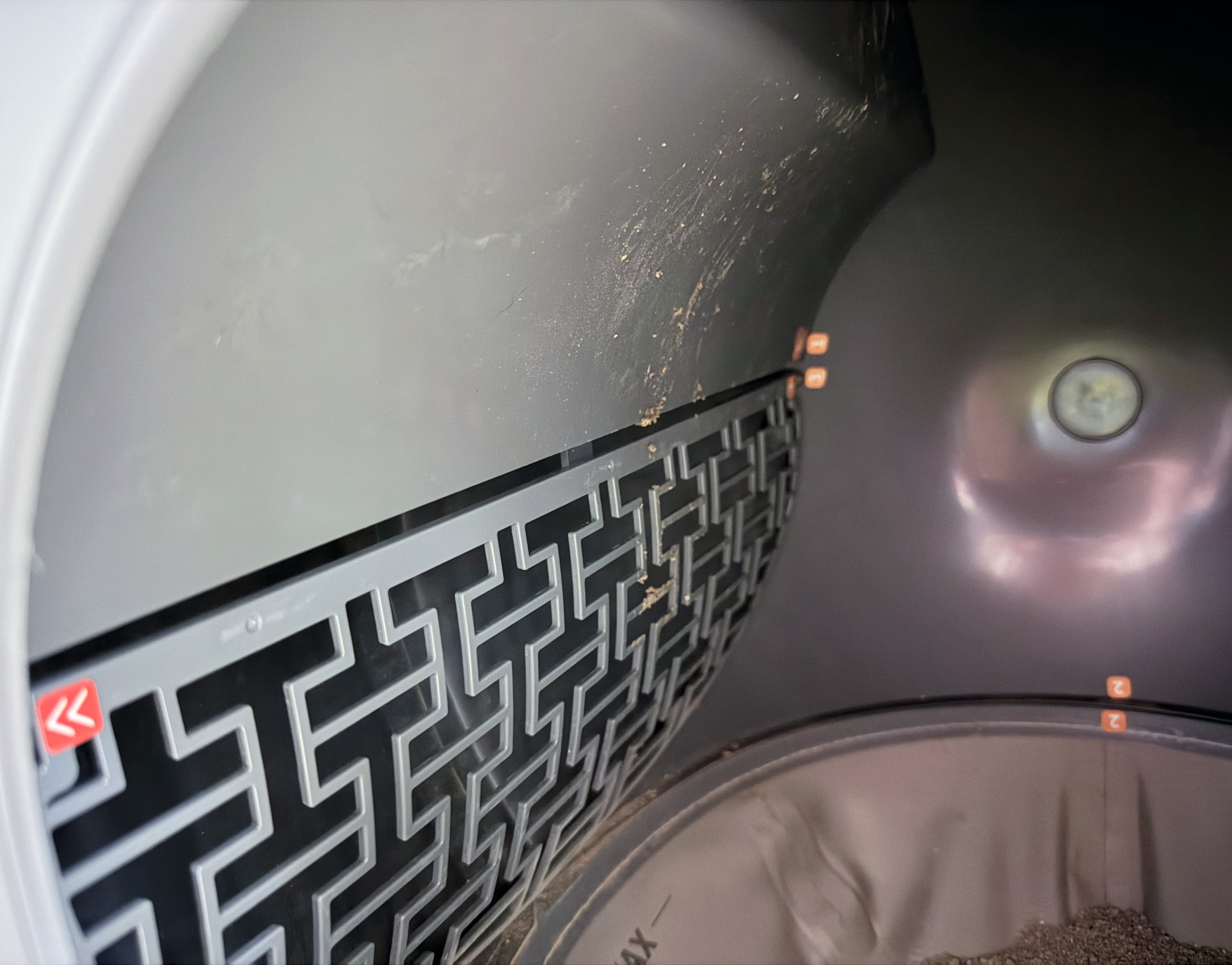 После сборки остается лишь засыпать наполнитель внутрь круглой чаши из гибкого материала, напоминающего прорезиненную ткань, натянутую на круглую основу-ободок. Очевидно, это сделано для того, чтобы было легко контролировать с помощью встроенных датчиков массу засыпанного/оставшегося наполнителя, а также вес самой кошки. Зная, как кошки любят своими лапками загребать и разравнивать после себя, остается лишь гадать, насколько прочным со временем окажется этот тканный материал против кошачьих когтей. Затяжки, возможно, появятся, но материал прочный и наверняка не сможет быть сильно поврежден коготками до порезов.