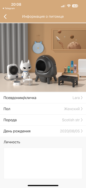Далее программа позволяет нам добавить своих питомцев в данный аккаунт. Мы можем указать пол, породу, дату рождения и обязаны указать имя и вес питомца, чтобы приложение могло рассказывать нам, опираясь на эти данные, какой из наших котов посещал лоток, ведь питомцев может быть больше одного. Также можно дать доступ другим членам семьи для управления устройством с помощью их смартфонов.