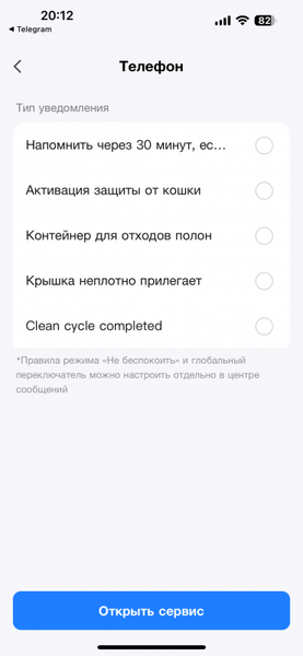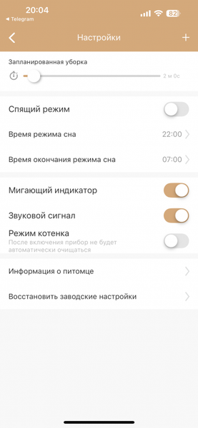 С помощью приложения можно настроить период автоматической уборки или вовсе его отключить, включить или отключить световые и звуковые сигналы, активировать безопасный режим «котенка». Приложение может посылать множество уведомлений с различными типами напоминаний. Например, на телефон придет сообщение в виде SMS или пуш-уведомления, если неплотно задвинут лоток, кончился наполнитель, проведена уборка и т. д.
