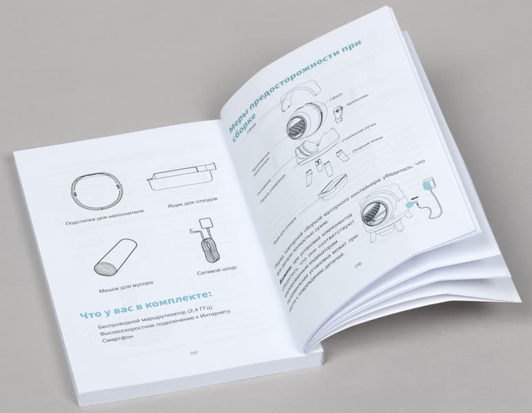 Помимо краткой одностраничной наглядной инструкции по сборке в комплект вложено также полное руководство пользователя, которое представляет собой цветную брошюру на 224 страницы. Инструкции в ней представлены на английском, немецком, французском, испанском, итальянском, португальском и русском языках. В ней можно найти подробное описание всех частей устройства, правила сборки и ухода за туалетом, а также описание панели управления и мобильного приложения (туалет подключается к Wi-Fi).