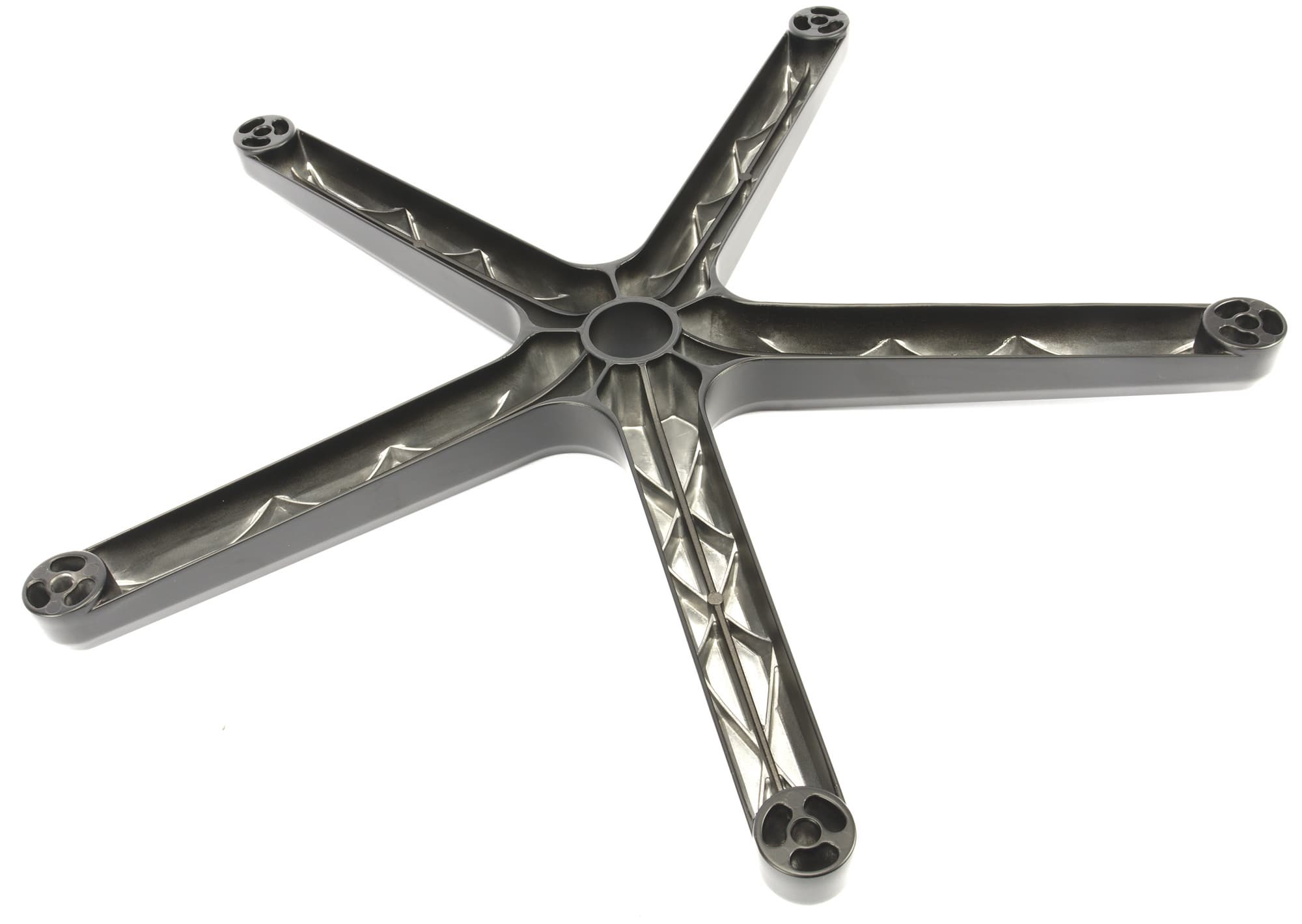 Сразу же приступим к сборке и по ходу дела будем подмечать всевозможные нюансы и особенности. Извлекаем все детали из коробки. Начинаем, как водится, с основания кресла — пятилучевая крестовина из алюминия. Перевернув крестовину, видим множество ребер жесткости.