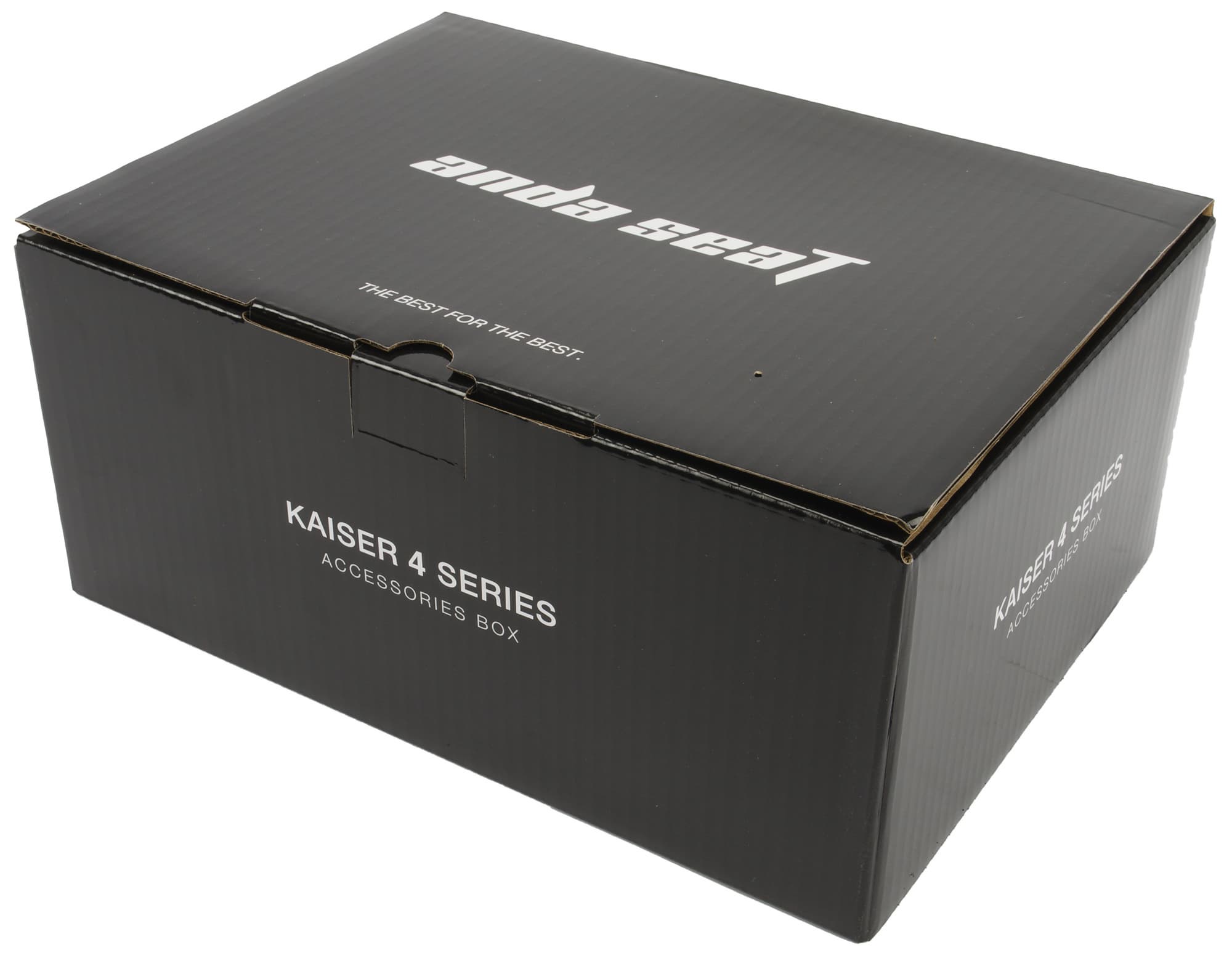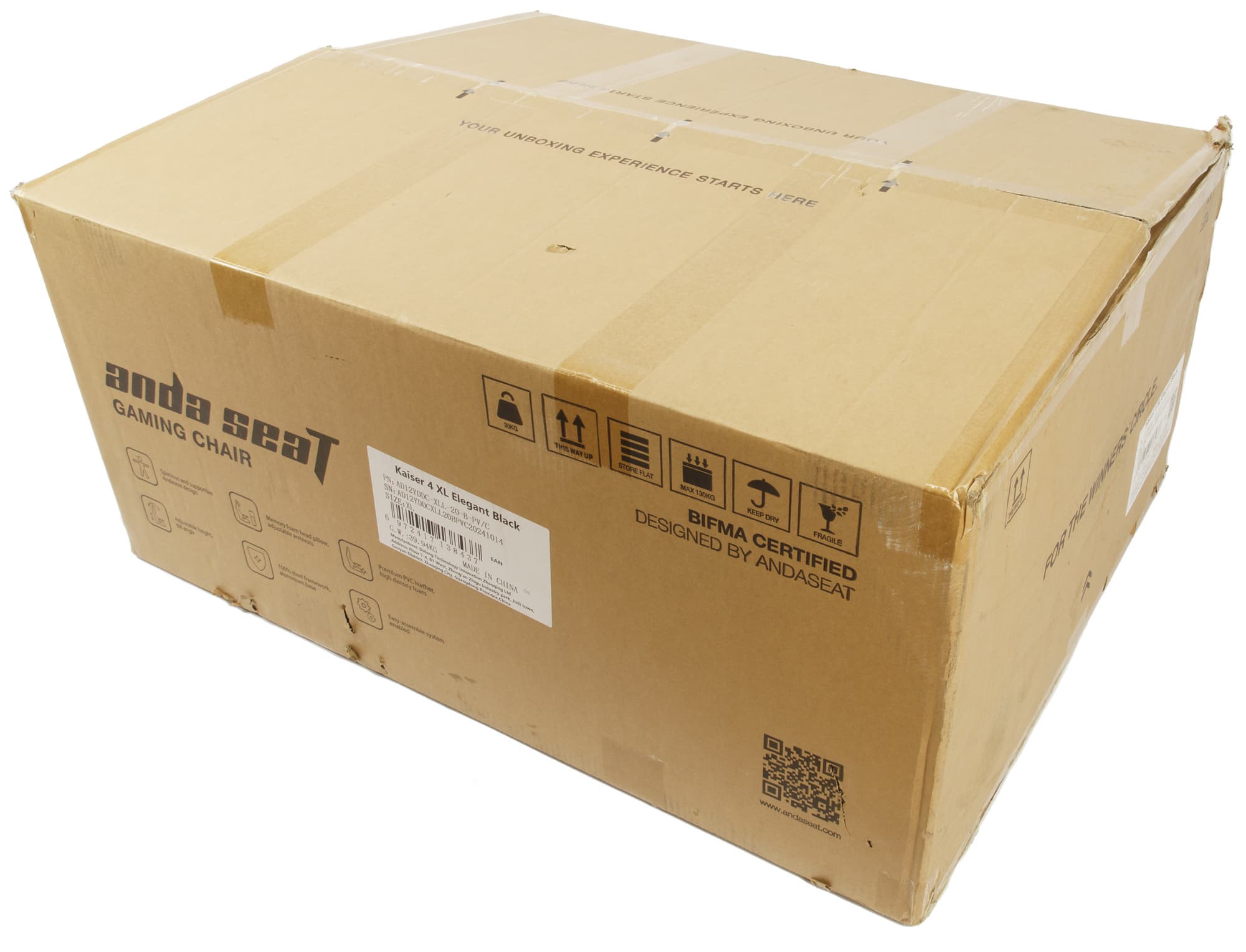 Кресло AndaSeat Kaiser 4 XL предстало перед нами в упаковке из коричневого «технического» картона. Спереди на ней крупно написано название компании и чуть помельче — тип устройства. Список пиктограмм повествует об основных особенностях кресла, в числе которых производитель упоминает собственный дизайн, регулировку спинки и сиденья, магнитное крепление подлокотников и подголовника, стальную раму, премиальные материалы обивки и наполнителя, а также легкость сборки.