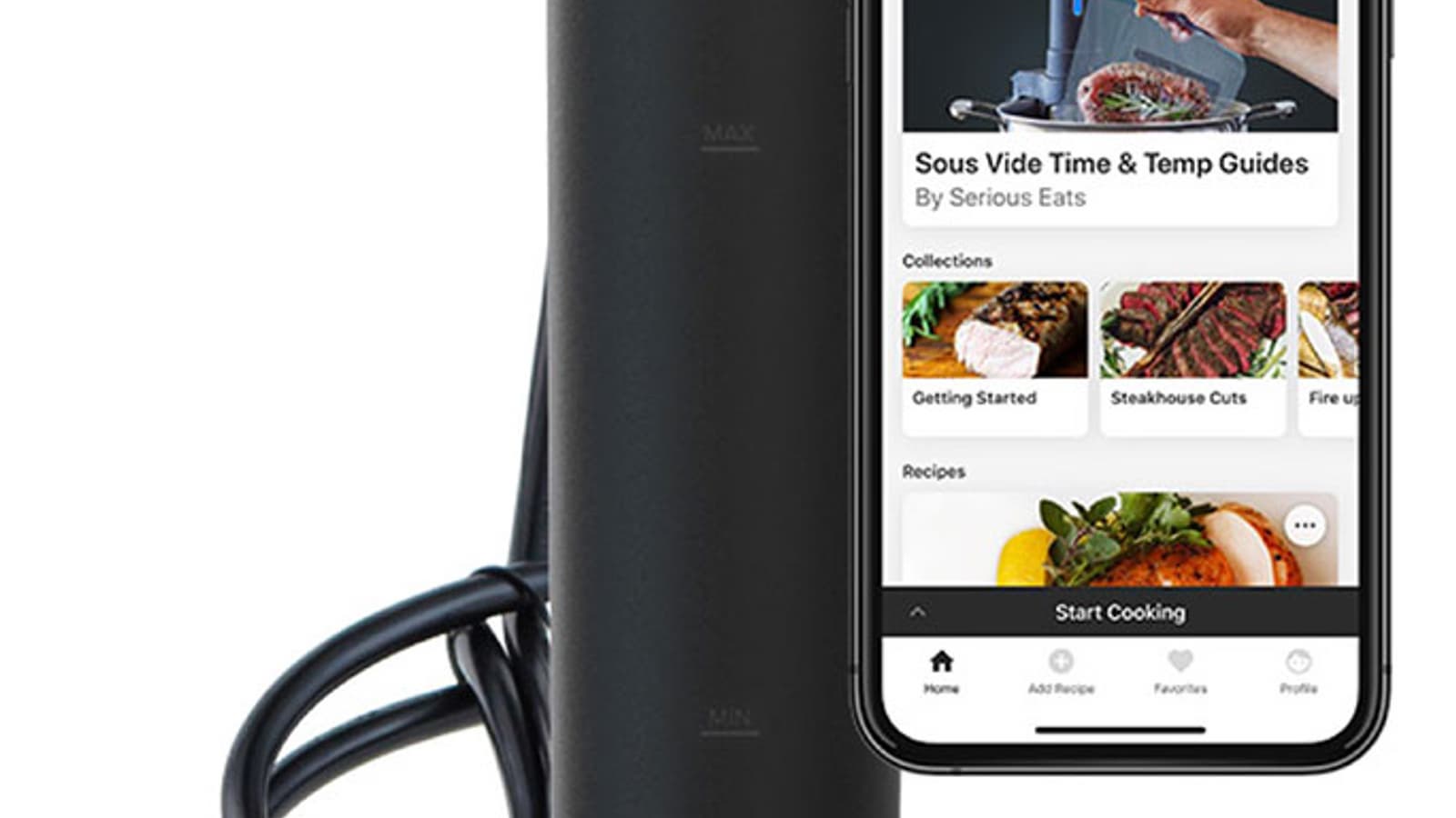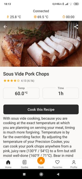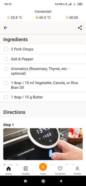 Отдельно отметим высокое качество специального приложения, в котором можно найти рецепты и источники кулинарного вдохновения на все случаи жизни. Эти же рецепты можно добавить в избранное и впоследствии использовать в качестве списка покупок, сверяясь с ними прямо в магазине. Очень удобно, особенно для тех, кто только начинает знакомство с приготовлением блюд в су-виде.