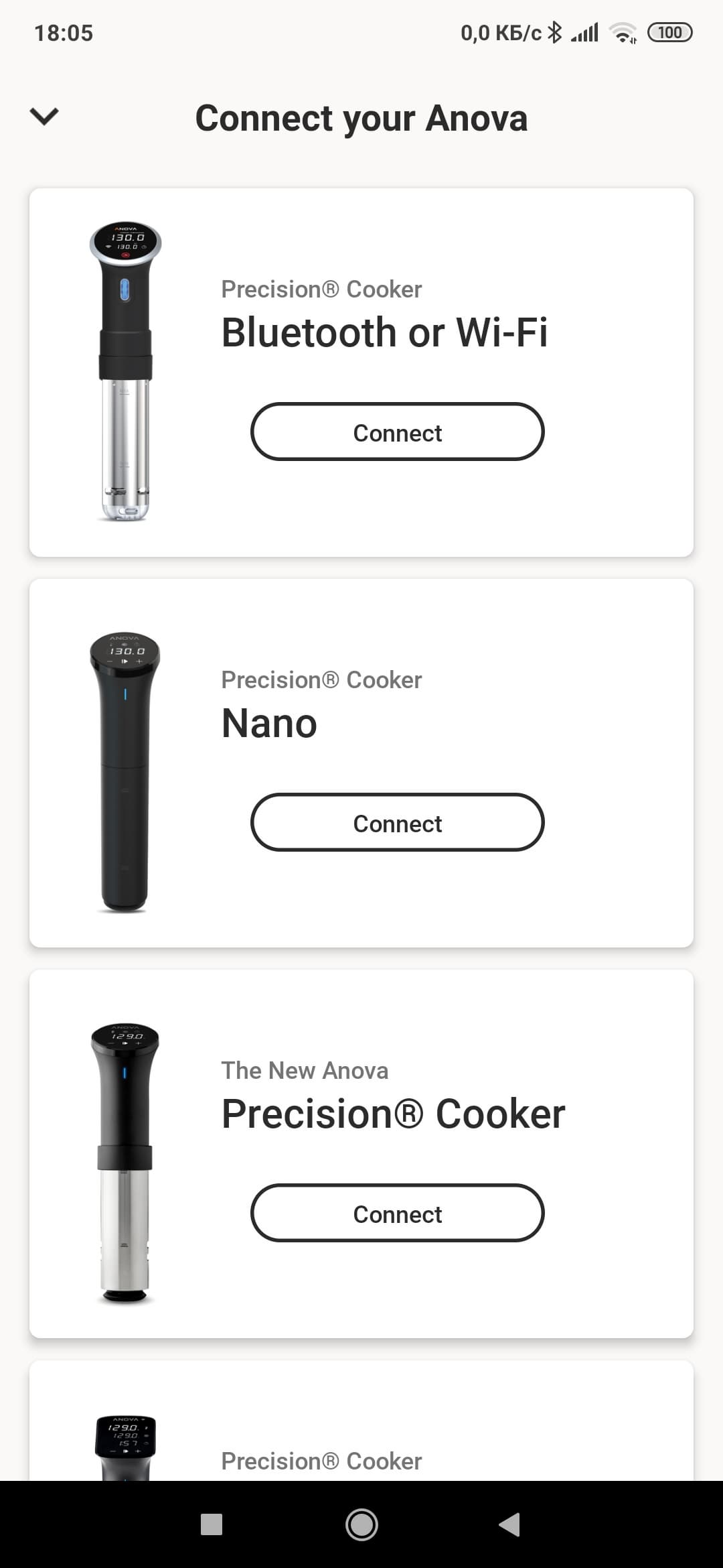 Прибор допускает управление с помощью мобильного приложения Anova, доступного для загрузки из магазинов Apple и Google.