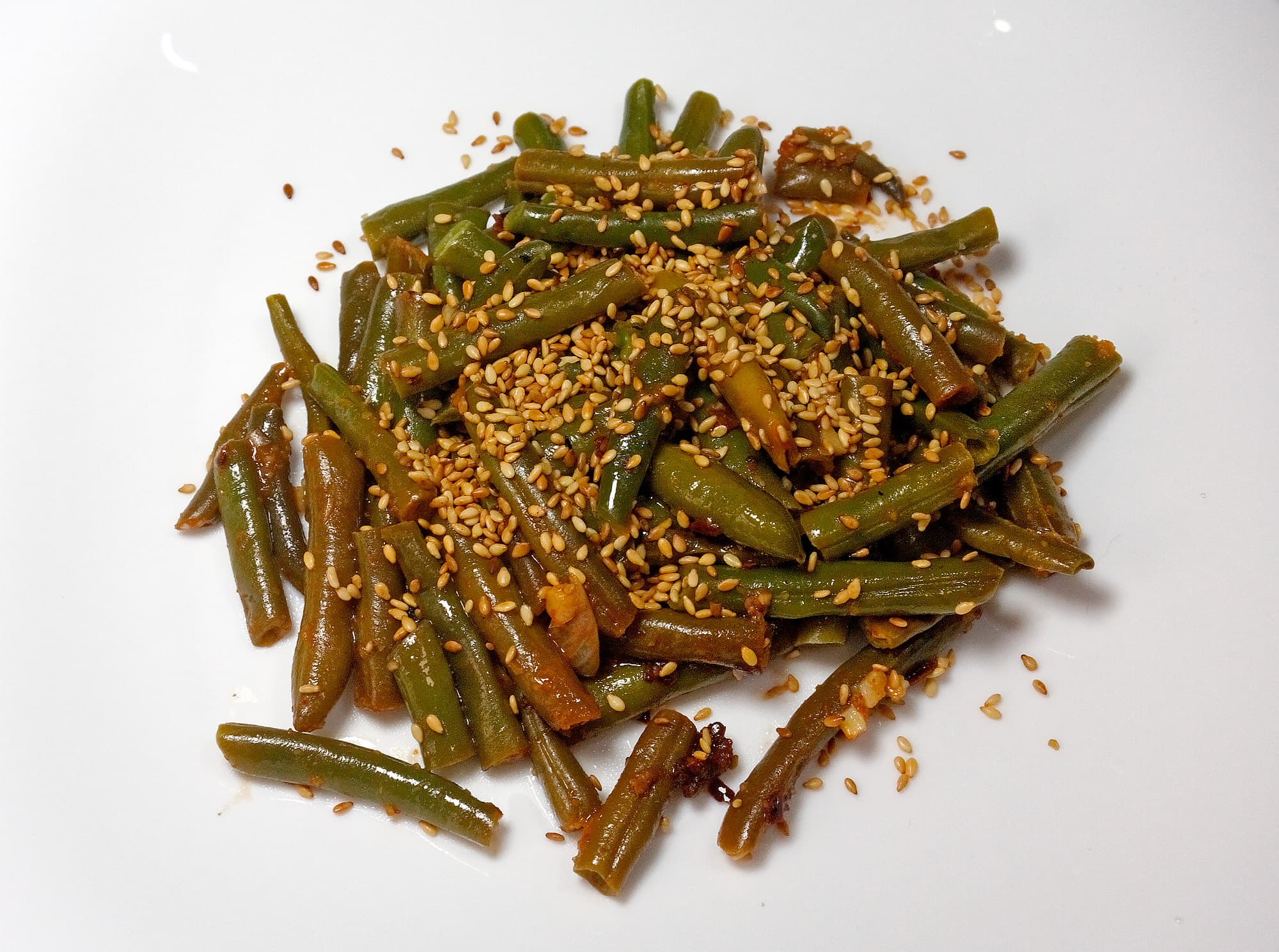 Для подачи такой фасоли можно использовать обжаренные семечки кунжута и нарезанный зеленый лук.