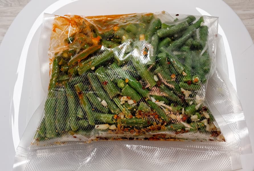 Мы поместили в вакуумный пакет фасоль, немного соуса чили, хлопья острого перца, сушеный лук, кунжутное масло и чесночную соль. Хорошо встряхнули и запаковали пакет в режиме «влажных продуктов».