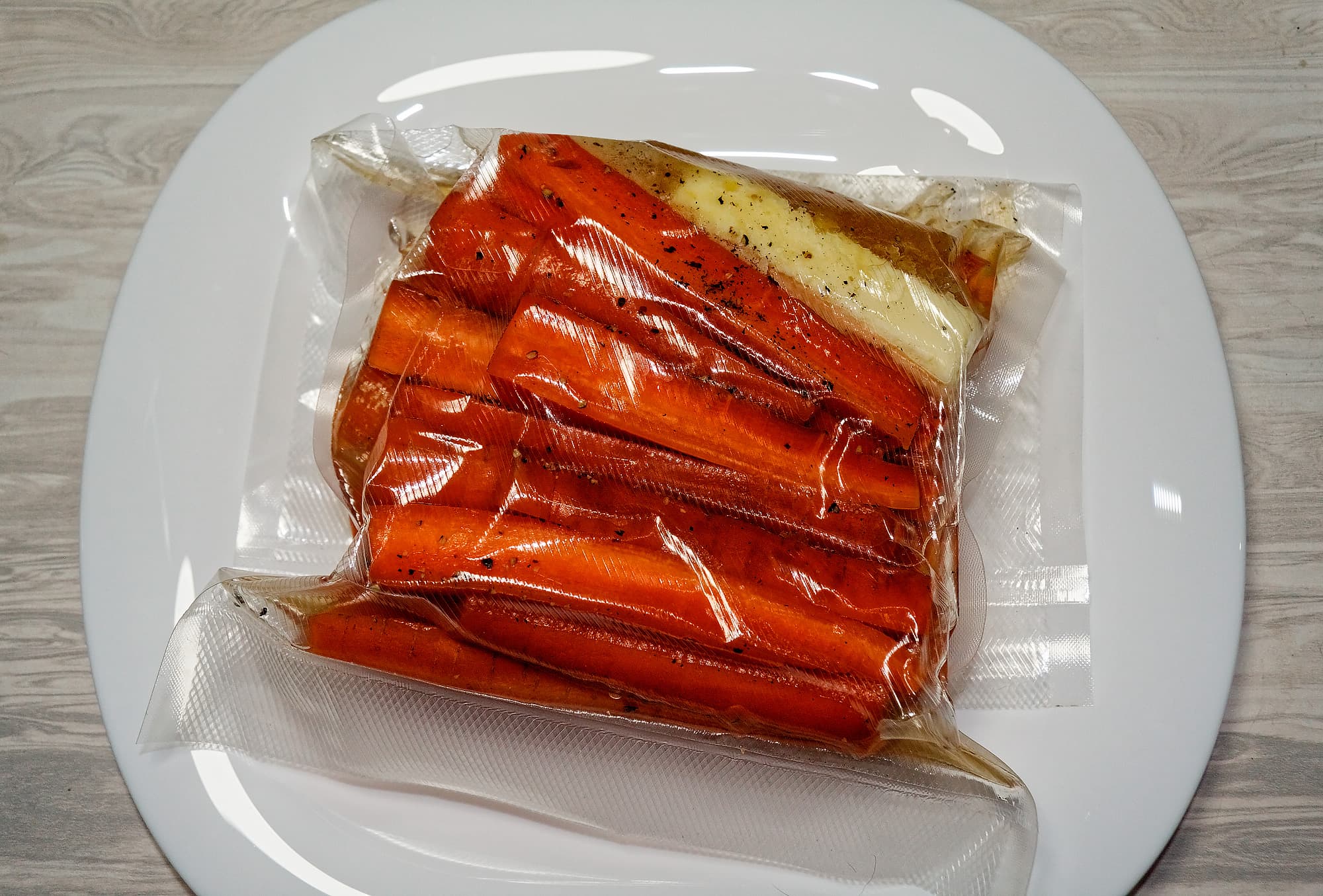 Морковь нарезали на кусочки небольшого размера, поместили в вакуумный пакет, добавили туда же сливочное масло, несколько ложек меда, немного соли и перца.