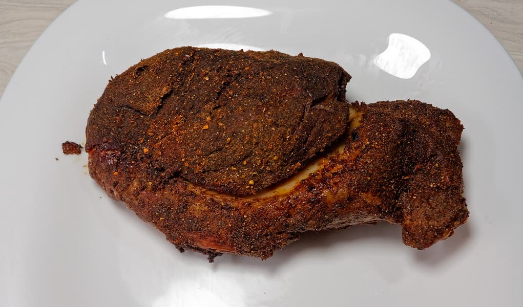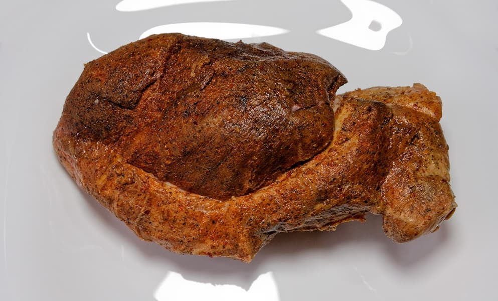 Обсушиваем, слегка натираем специями (повторно), отправляем в духовку, разогретую до 150 °C, и дожидаемся, пока внешний слой не потемнеет (на час-полтора в зависимости от размера куска).