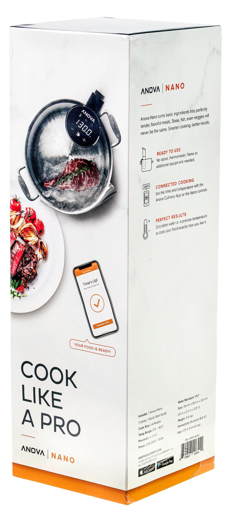 Герой нашего сегодняшнего теста — погружной су-вид Anova AN-400 (он же Anova Nano) — выглядит вполне стандартным в том, что касается внешнего вида. Однако при этом прибор оснащен беспроводным модулем, позволяющим управлять им дистанционно, с помощью мобильного приложения. Теоретически это может открыть перед поваром новые возможности либо просто облегчить его работу, позволяя контролировать происходящее на кухне удаленно. Давайте взглянем на прибор и разберемся, так ли это на самом деле.