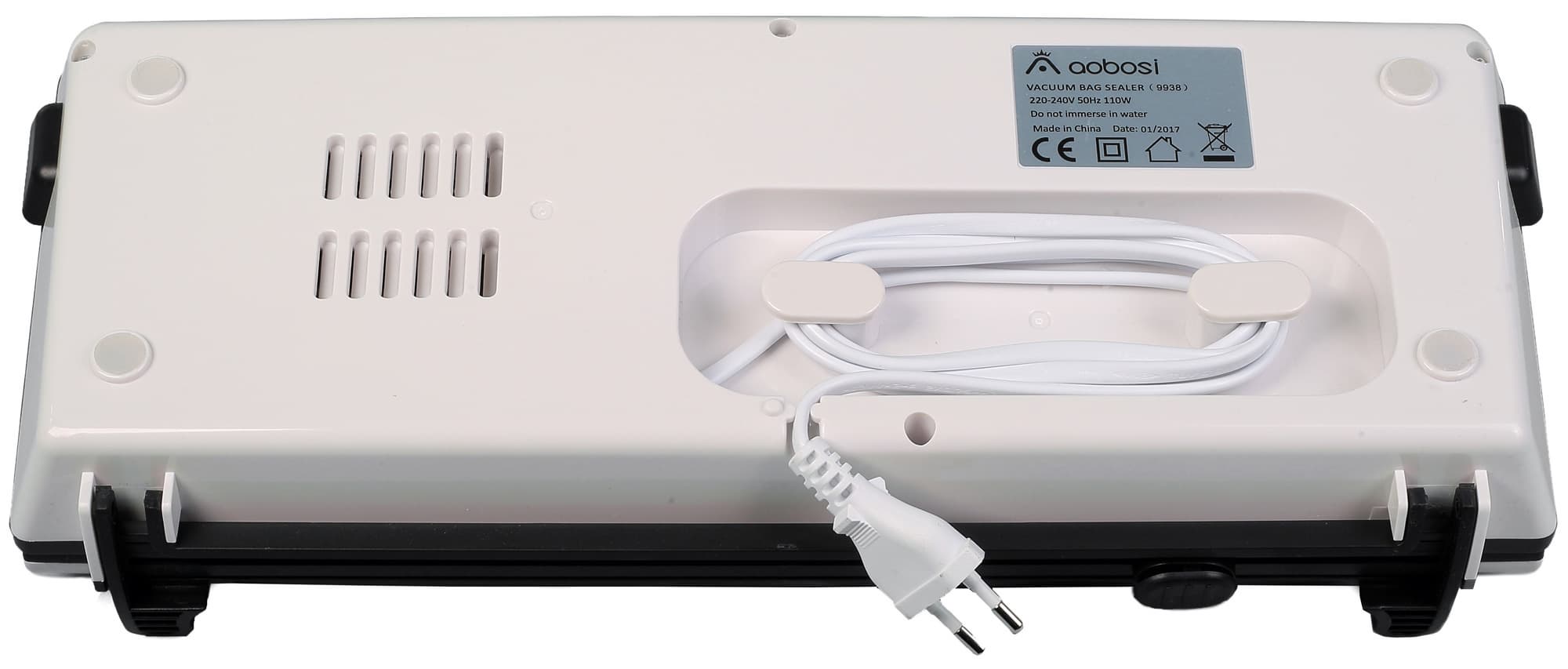 Устройство вакууматора довольно стандартно: с нижней стороны можно увидеть вентиляционные отверстия, резиновые ножки, препятствующие скольжению, и отсек для намотки и хранения шнура питания.
