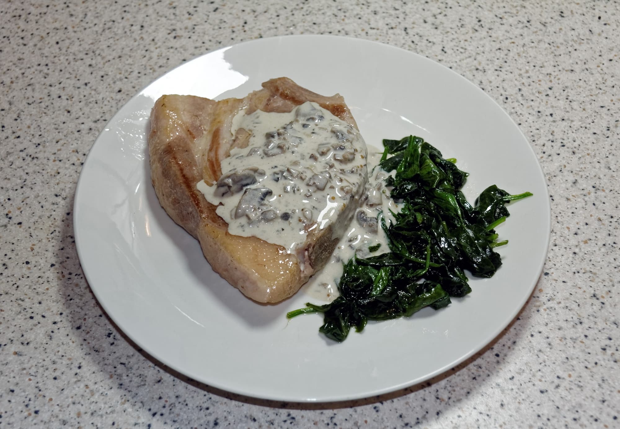 За 10 минут до окончания приготовления свинины можно заняться соусом и шпинатом. Шпинат достаточно слегка припустить на сковороде с небольшим количеством оливкового масла. Для приготовления соуса нарезанные грибы помещаются в сотейник, где слегка обжариваются на сливочном масле, после чего сотейник снимается с огня, в него вливаются сливки и добавляется горчица, и он снова возвращается на небольшой огонь. Соус надо периодически помешивать до загустения. Соль и перец добавляются по вкусу.