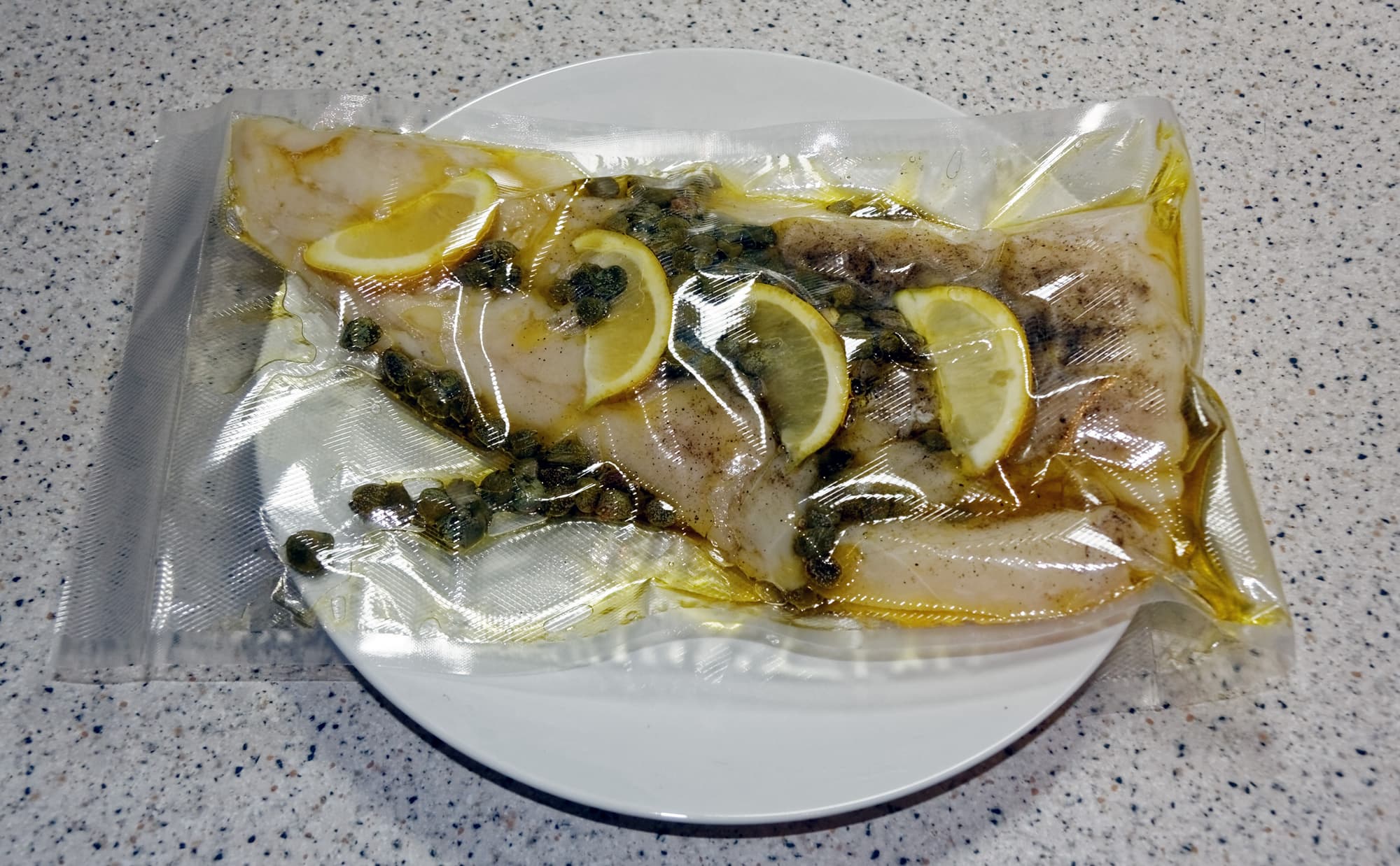 Филе трески солится и приправляется перцем, после чего отправляется в вакуумный пакет вместе с остальными ингредиентами. В оригинальном рецепте 350 граммов трески готовятся 30 минут при температуре 55 градусов.
