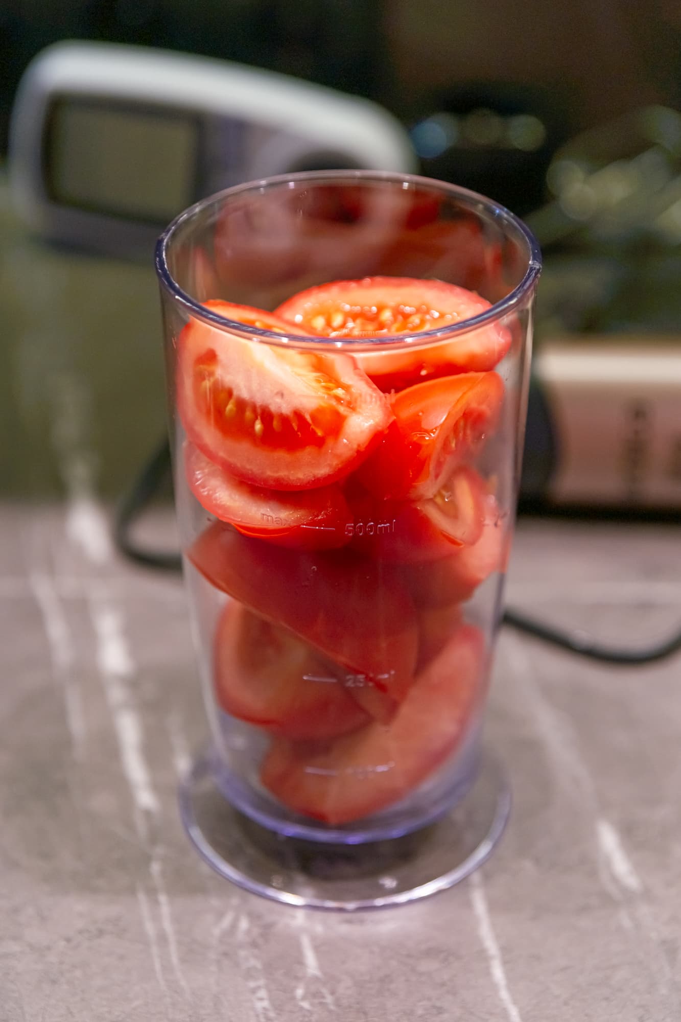 В густой массе всё еще были видны крупные кусочки шкурки, и для верности мы включили блендер еще на 20 секунд, а в завершении добили помидоры несколькими запусками режима Турбо по паре секунд каждый. В результате шкурки стали значительно меньше, семена частично перемололись, сама масса получилась достаточно воздушной.