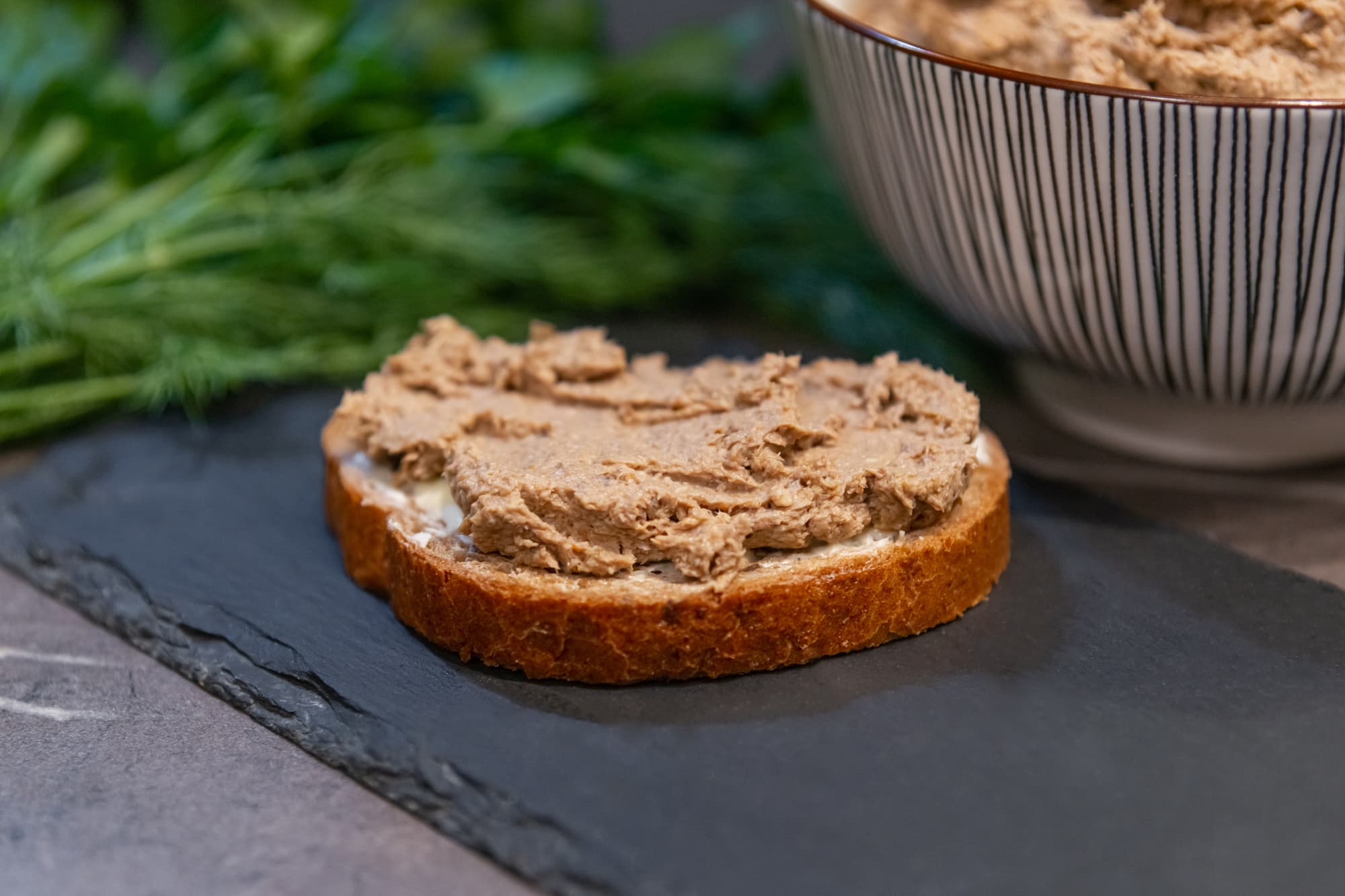 В чашу измельчителя поместили первую половину продуктов: заранее поджаренную с морковью и луком куриную печень, отварную куриную грудку и сливочное масло комнатной температуры. Сверху присыпали солью, мускатным орехом и горсткой измельченных грецких орехов из предыдущего теста.