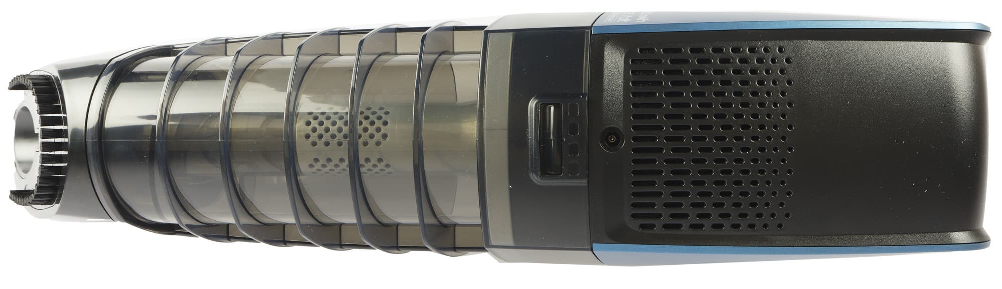 Решетка для выпуска воздуха размещена на нижней части моторного блока. Каких-либо дополнительных фильтрующих элементов на выходе эта модель лишена. Рядом с решеткой — круглое гнездо для подключения зарядного устройства.
