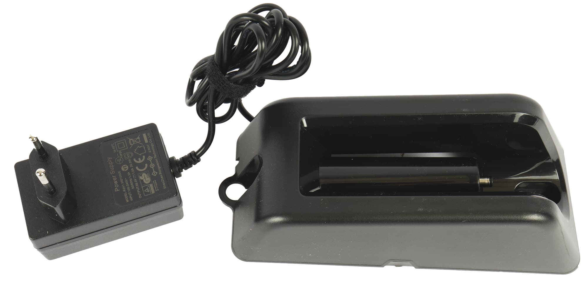 Для зарядки и хранения используется настенное крепление, к которому подключается адаптер постоянного тока (35 В 1 А).