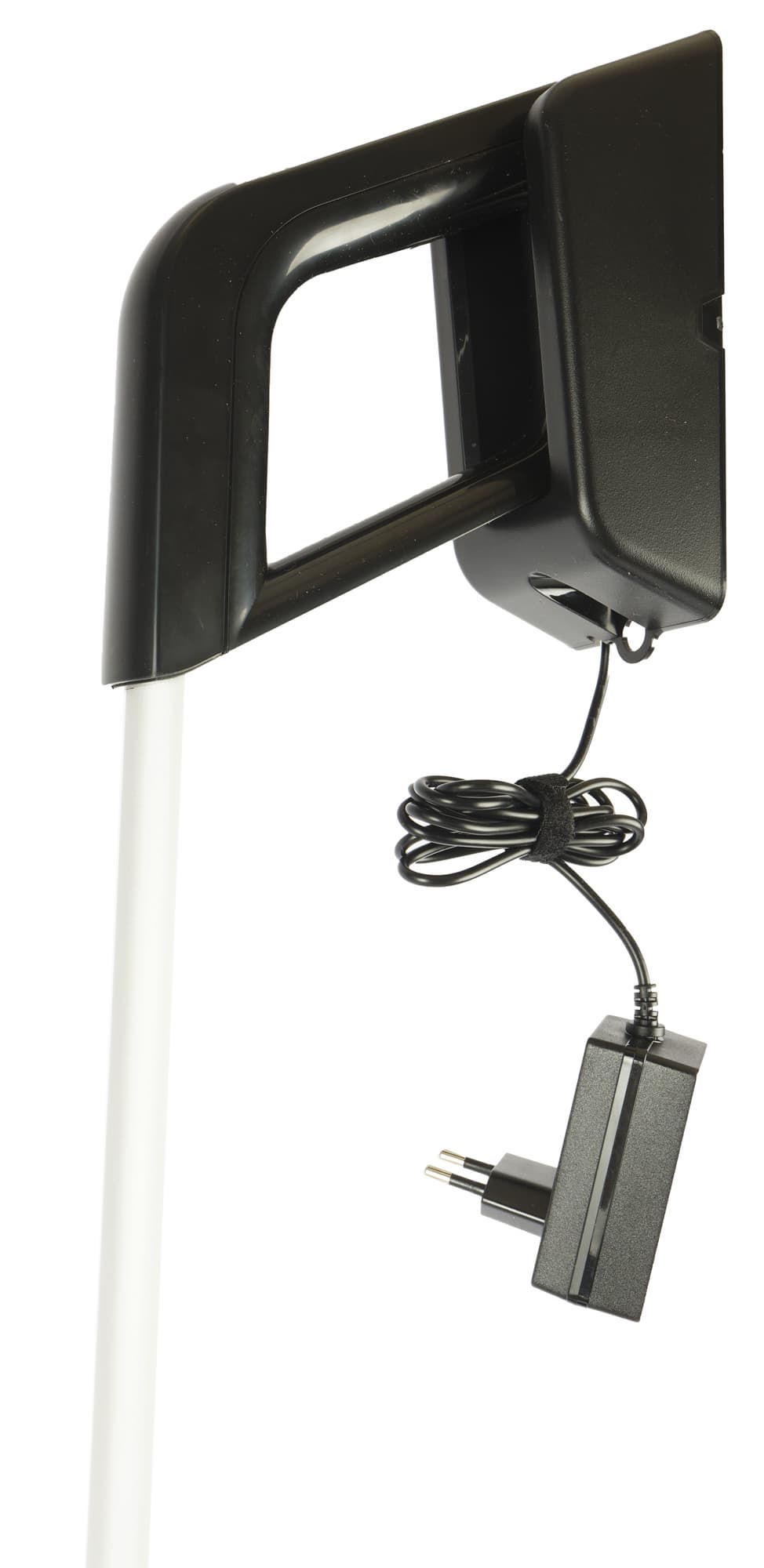 Для уборки пола предназначена удлинительная трубка с D-образной рукояткой. На торце ручки мы видим разъем для подключения к зарядному устройству. А вот органов управления здесь нет — чтобы включить или выключить прибор в напольной конфигурации, необходимо нагнуться к моторному блоку.