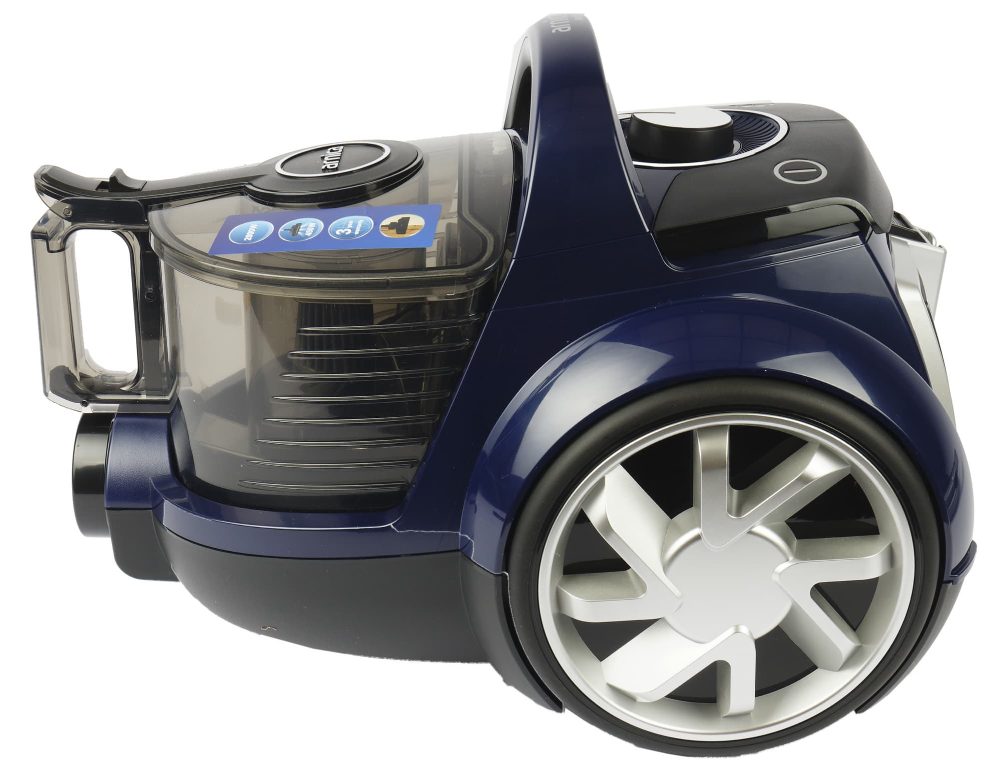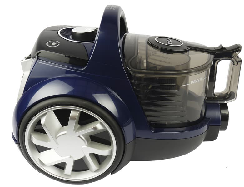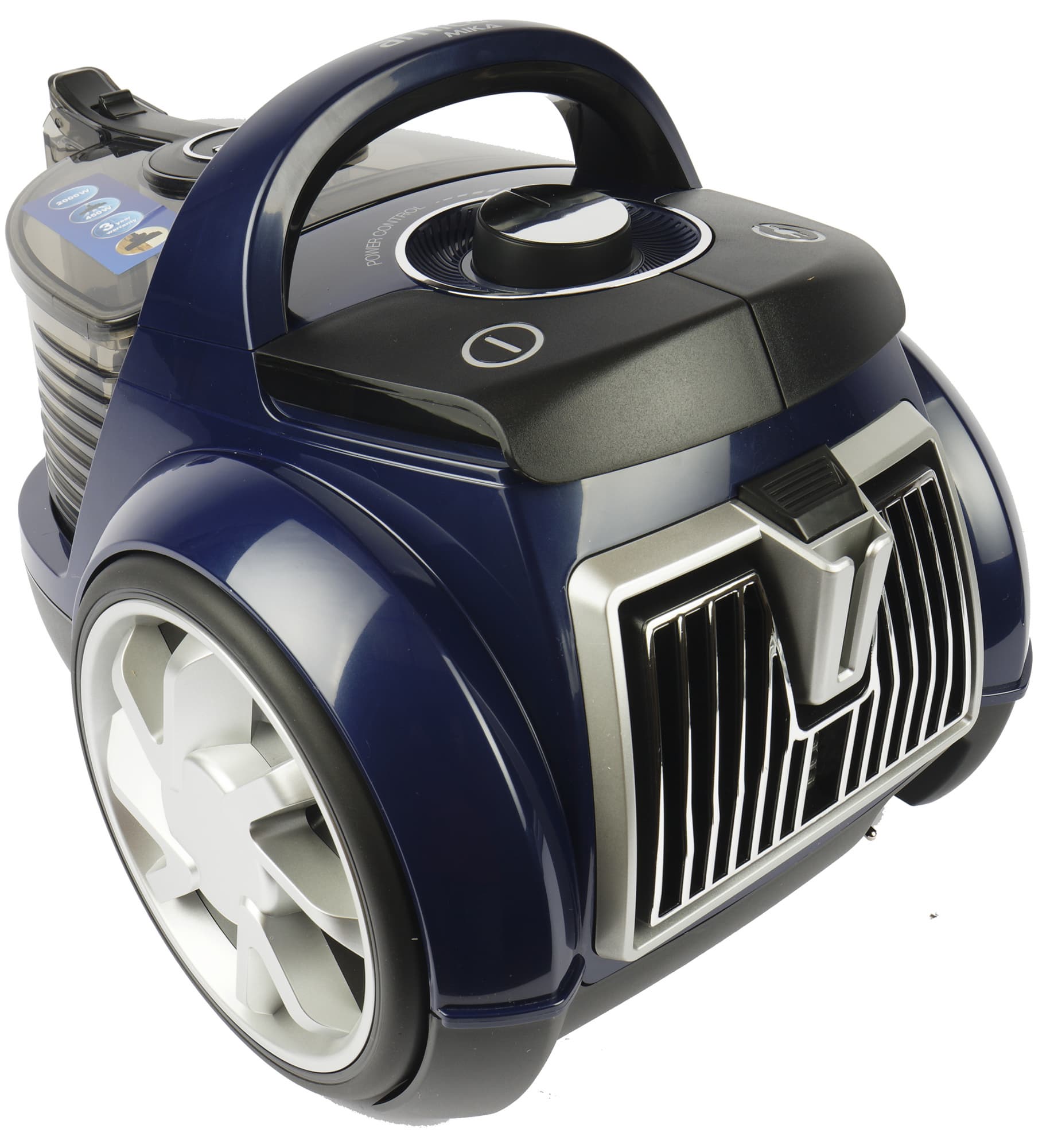 Сине-черный корпус пылесоса сделан из глянцевого пластика.
