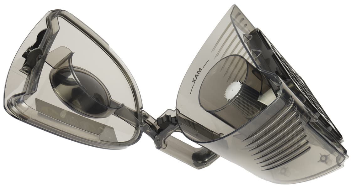 В центре контейнера установлен несложный циклонный элемент. Центробежная сила отбрасывает крупный мусор к стенкам бака сквозь верхнее отверстие шахты, а струя воздуха с пылью проходит через коническую решетку и опускается вниз, к фильтру тонкой очистки.