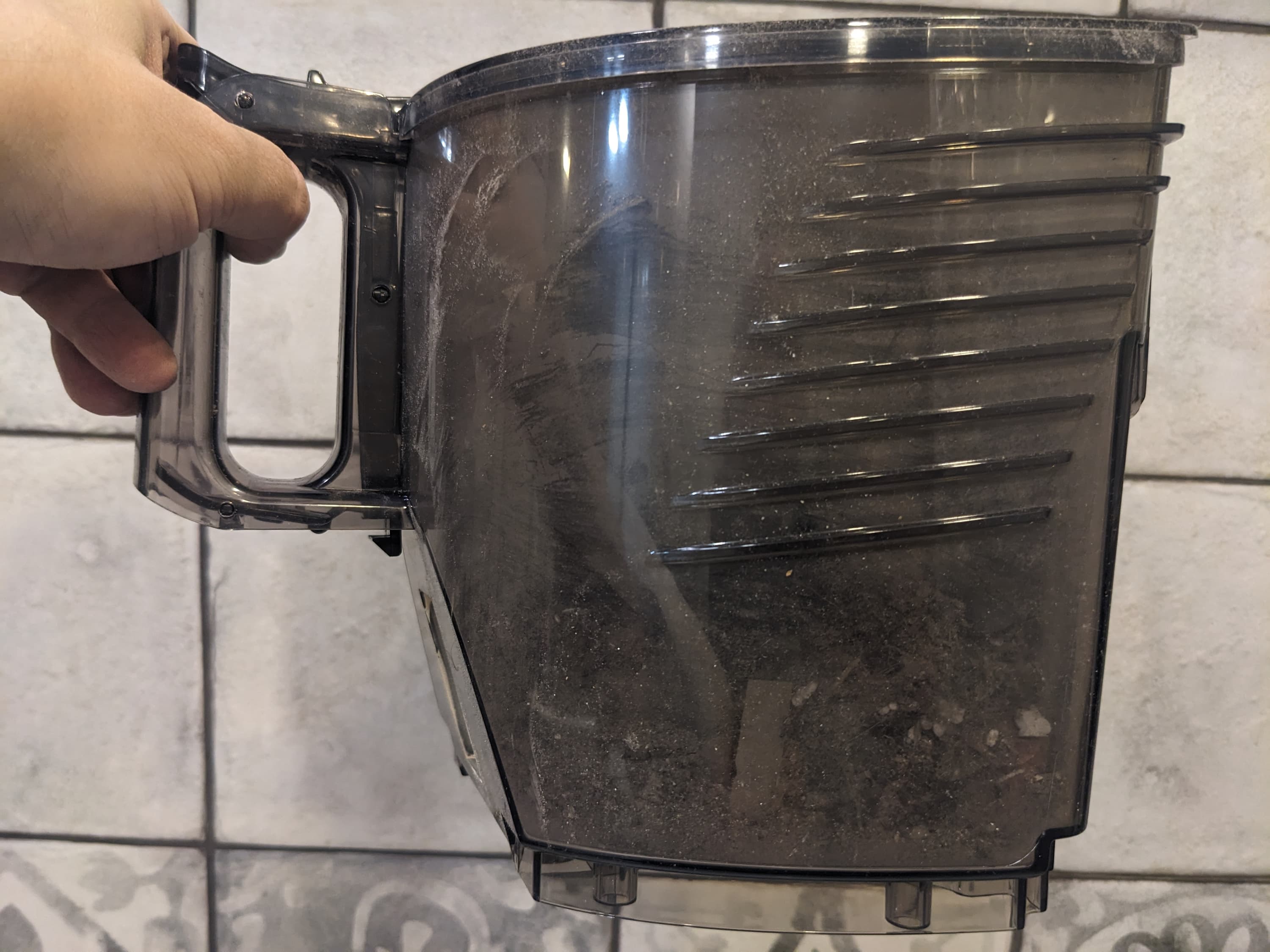 Пылесборник у этой модели такой большой, что за почти три недели тестирования в трехкомнатной квартире нам не удалось его наполнить.