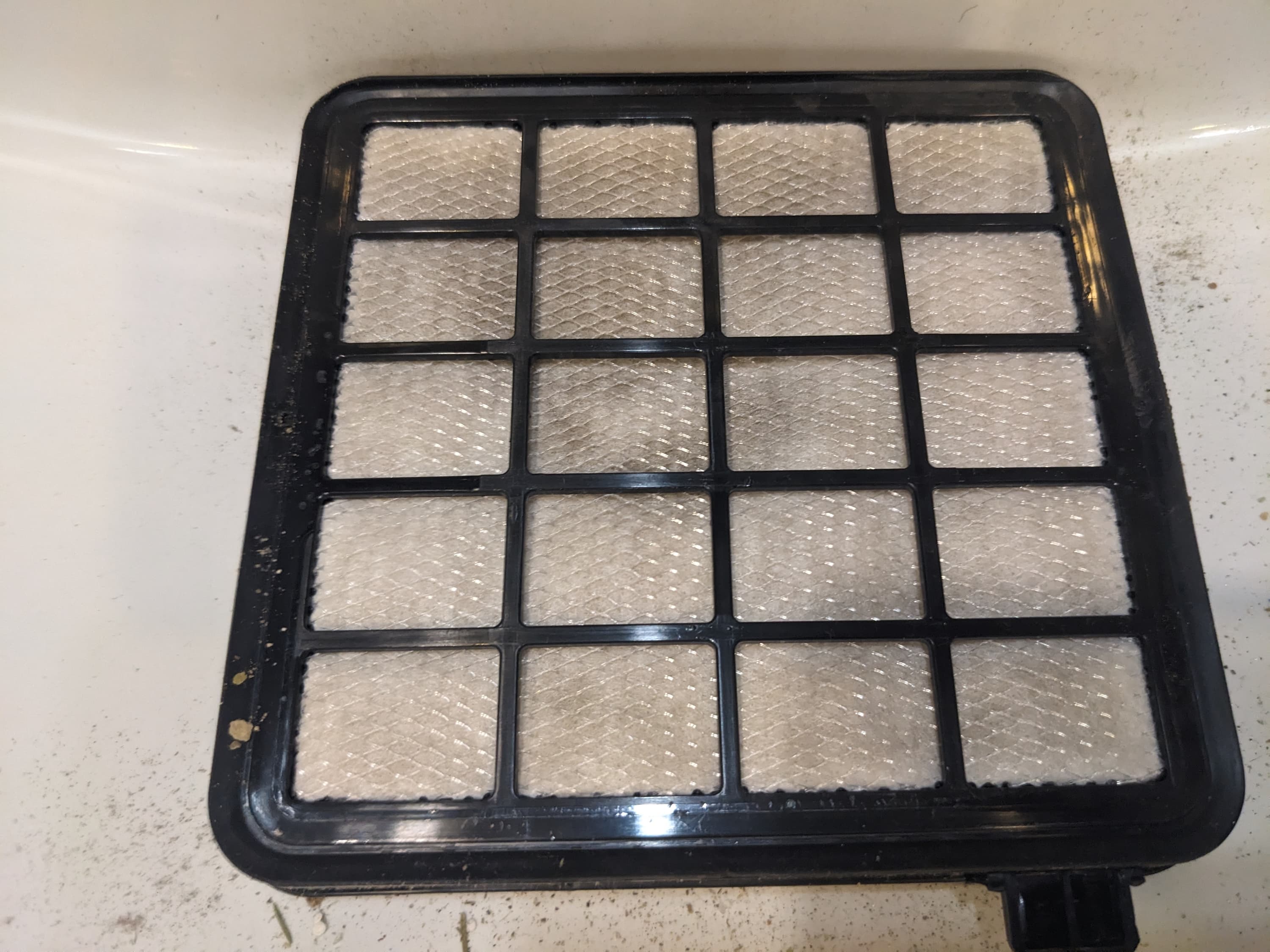 Квадратное выпускное отверстие контейнера закрыто моющимся фильтром тонкой очистки из нетканого материала, закрепленного на пластиковой решетке. Перед ним расположен квадратный поролоновый элемент.