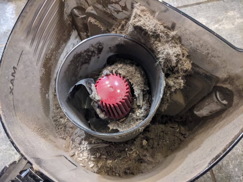В центре емкости — циклонный элемент несложной конструкции. Благодаря центробежной силе мусор крупных фракций отбрасывается к краям контейнера через отверстие наверху шахты, а поток воздуха с пылью проходит через решетку конической формы и опускается вниз, в направлении фильтра тонкой очистки.
