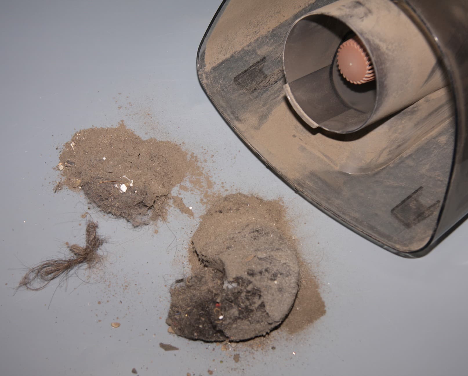 При перевороте пылесборника мусор выскользнул в виде двух компактных кучек с минимальным образованием клубящейся пыли.