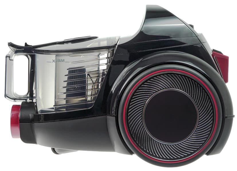 Поток воздуха с пылью и мусором попадает в контейнер через отверстие под ручкой, закручивается против часовой стрелки благодаря аэродинамическим элементам и поднимается вверх через центральную трубку.