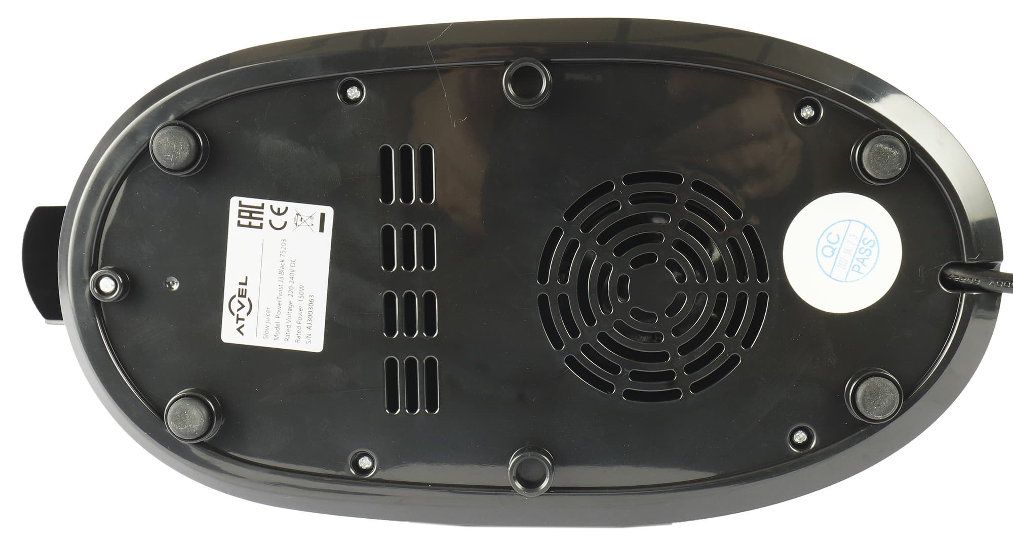 Корпус Atvel PowerTwist J3 устойчиво держится на поверхности стола за счет шести ножек, четыре из которых — прорезиненные. Также на дне находятся вентиляционные отверстия и две наклейки: с техническими характеристиками и датой выпуска устройства.