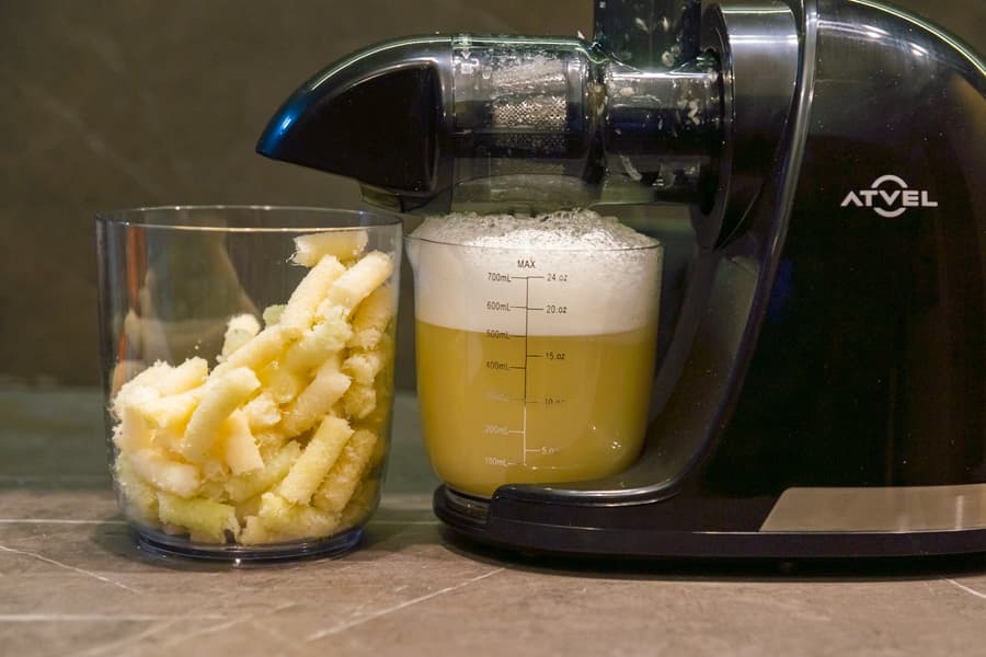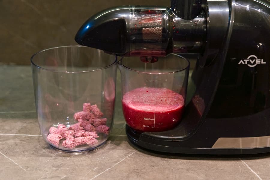 Процесс отжима сока оказался прост и комфортен. Вне зависимости от сложности перерабатываемых ингредиентов соковыжималка одинаково хорошо справилась с каждыми из них проявив себя как эффективное беспроблемное устройство. Шнек неторопливо измельчает, перемалывает и давит продукты, которые на выходе разделяются на сок с низким содержанием мякоти и небольшим количеством пены и почти сухой, а в некоторых случаях совсем сухой жмых. Atvel PowerTwist J3 очень тихая, повышать голос при разговоре стоя рядом с ней не требуется. Горловина соковыжималки небольшая и плоды следует нарезать как минимум на 4, а то и 6 частей. В случае с грейпфрутом, например, в горловину свободно проходит только одна-две дольки. Толкателем мы пользовались постоянно, иначе дело стопорится, особенно если ингредиенты твердые. Жмых во всех тестах оказывался сухим и тщательно измельченным. Особенно хорошо это видно в тесте с гранатом.