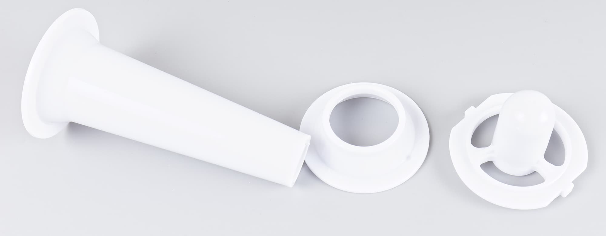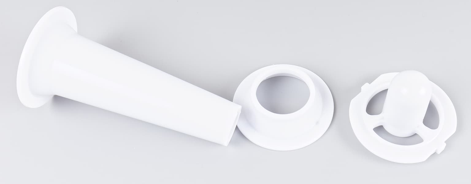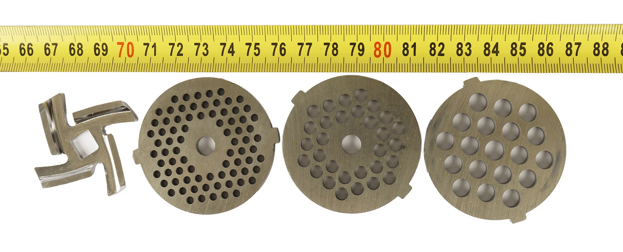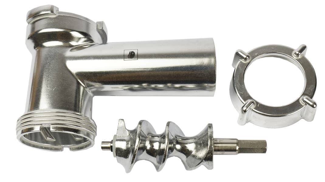 Составные детали насадки-мясорубки: загрузочная горловина с отверстием 4,5 см, шнек, нож, три решетки (3, 5 и 7 мм), кольцевая гайка и загрузочный лоток размером 14×20 см. Металл всех элементов обработан хорошо. Поверхности гладкие, без следов шлифовки, отливки или облоя.