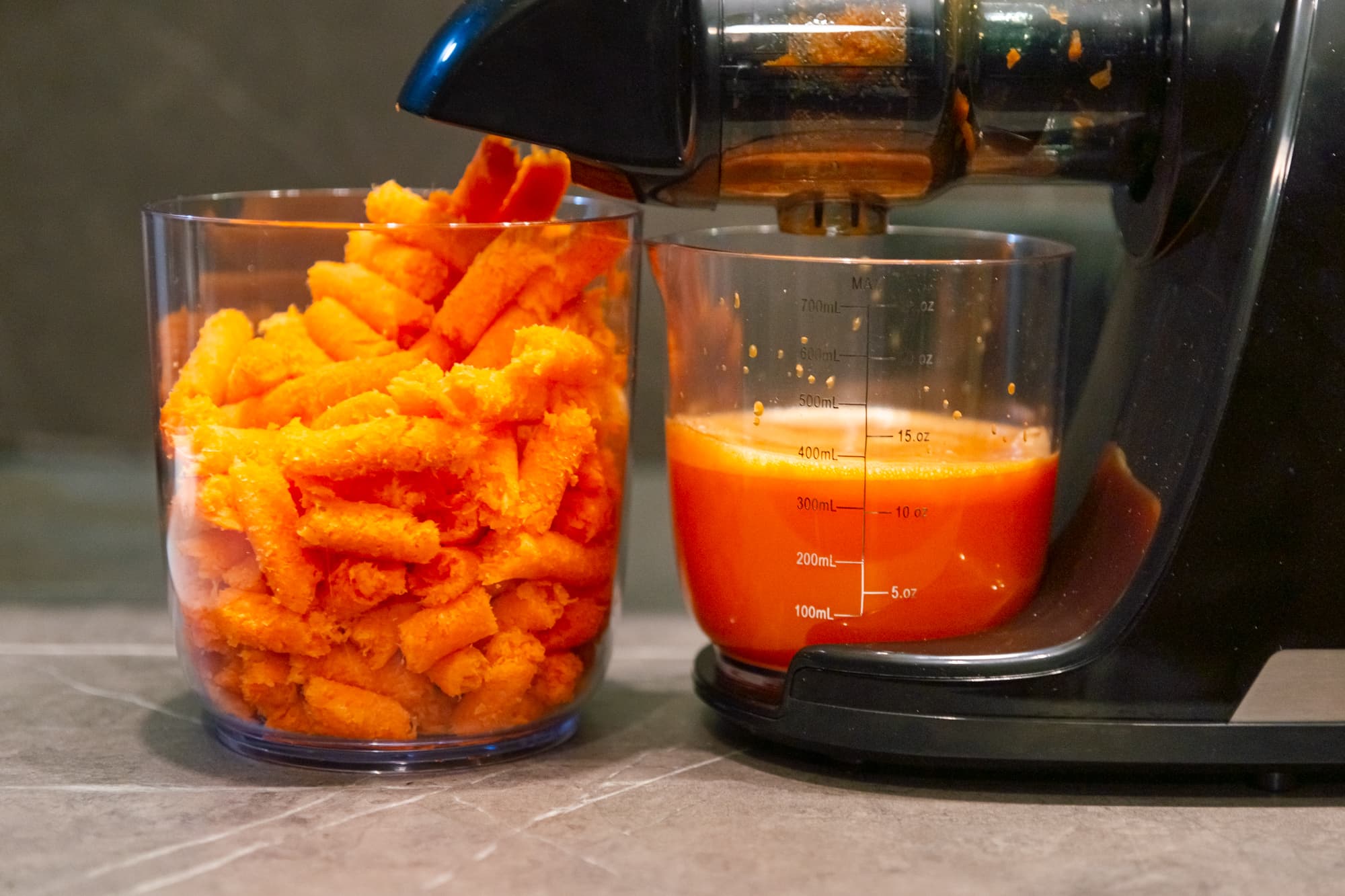 Очищенную морковь разреза́ли на две-три части, затем каждый брусок — вдоль, а некоторые — на четыре части. Создалось впечатление, что соковыжималке все равно что обрабатывать. Мягкое, твердое — прибор всё так же, стабильно тихо и тщательно, выжал из не самого простого плода сок в количестве 360 г. Сок плотный, с насыщенным вкусом и ярким ароматом. Жмых почти сухой.