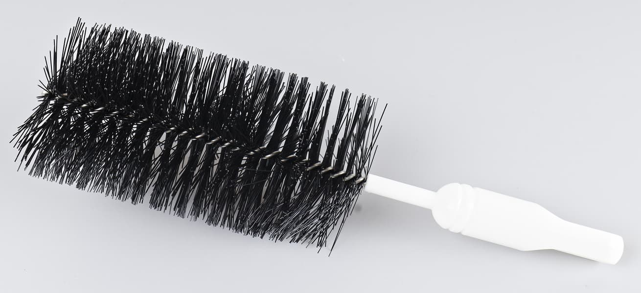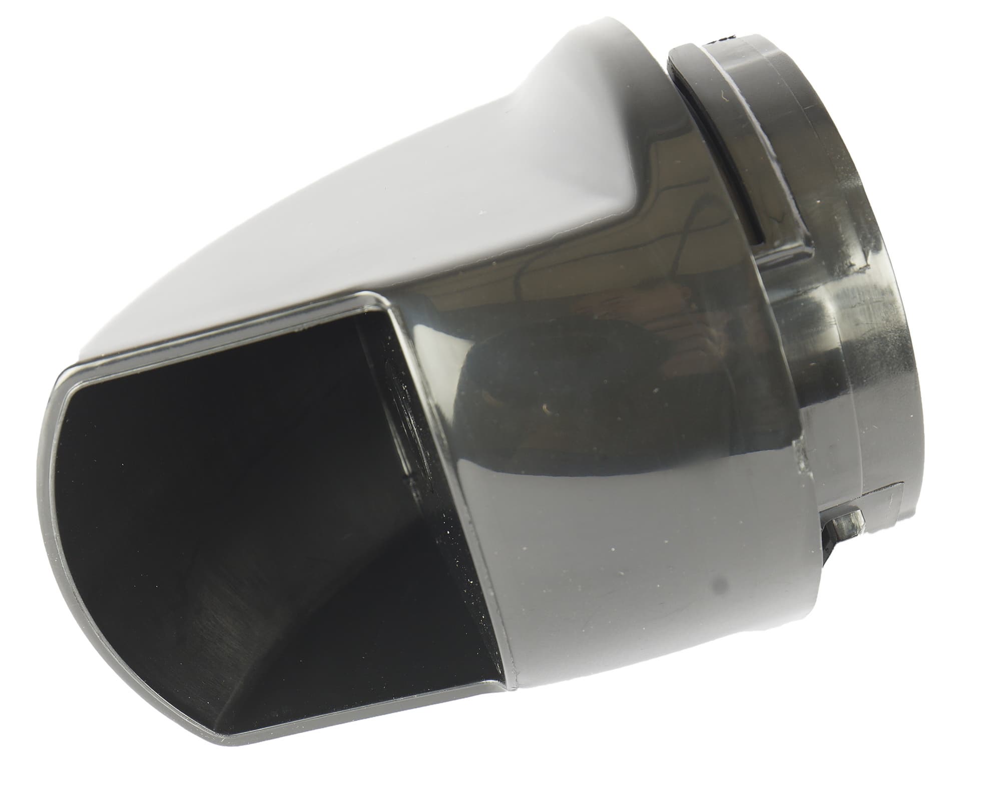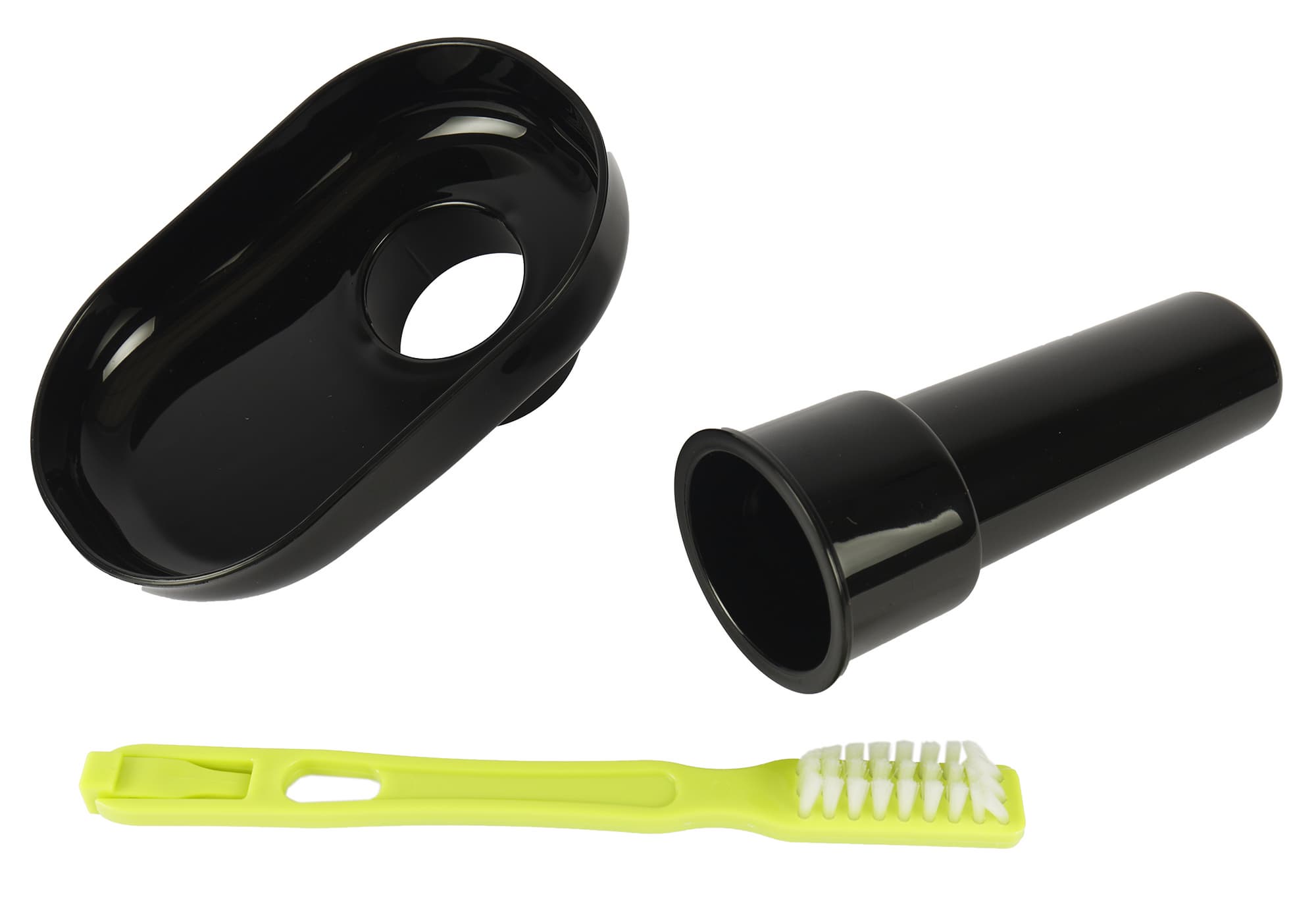 Размер отверстия овальной загрузочной горловины небольшой — 5×4,5 см. Лоток для загрузки продуктов и вовсе выглядит игрушечным. Смысла в нем, на наш взгляд, нет. Толкатель из той же черной пластмассы, что и лоток, полностью повторяет форму и размер горловины, но имеет утолщение в верхней части, чтобы деталь не доставала до шнека порядка 1 см. Поверхность пластиковой щеточки широкая, напоминающая зубную щетку, на другом ее конце еще одна щеточка из четырех пучков щетинок, для очистки труднодоступных мест.