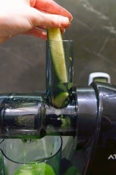 Для детоксного коктейля мы использовали всё самое зеленое, что нашлось под рукой. Начали с листьев. 140 г зелени пропустили через соковыжималку небольшими порциями, помогая толкателем, затем добавили горсть рукколы, около 50 г, и 100 г листьев салата. Зелень тихо передавливалась, и скоро в стакане для сока образовалось порядка 75 мл густого сока насыщенного зеленого цвета с пенкой. Выход сока из свежих сочных листьев составил 26%. За листьями в горловину последовали два стебля сельдерея. Их мы опускали целиком, не разрезая на кусочки. Потом настал черед яблока и, наконец, огурца.