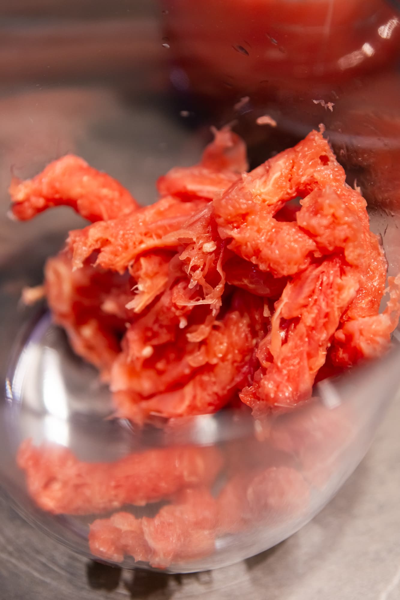 Ровно один килограмм очищенного грейпфрута мы разделили на дольки, местами удалив белые пленки.