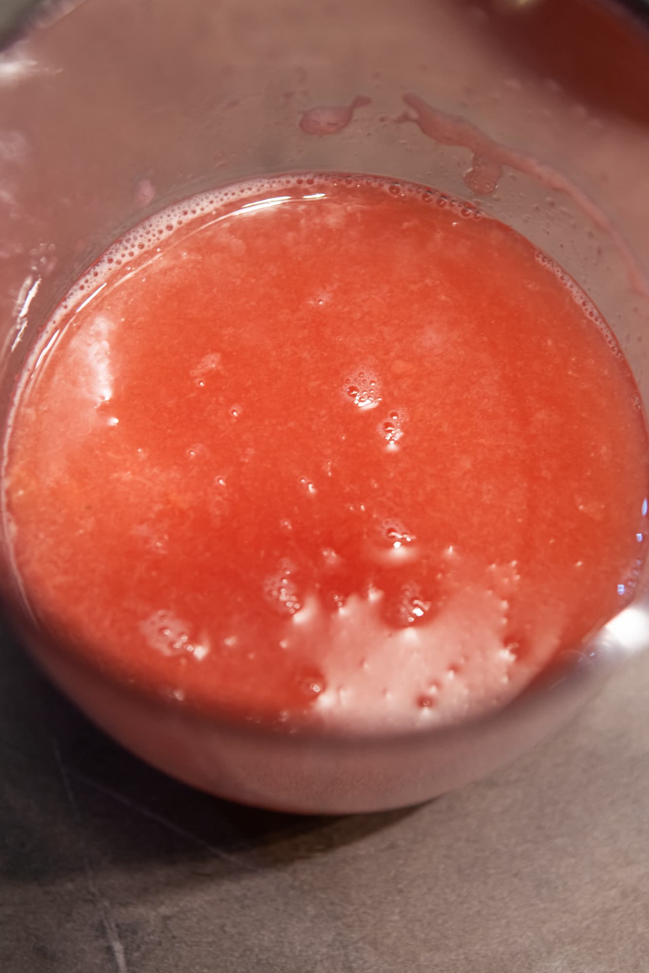 Мягкий сочный плод был методично раздавлен шнеком и на выходе превратился в ароматный сок с небольшим количеством мякоти и почти без пены. Жмых был слегка влажным. Выход сока составил 67%.