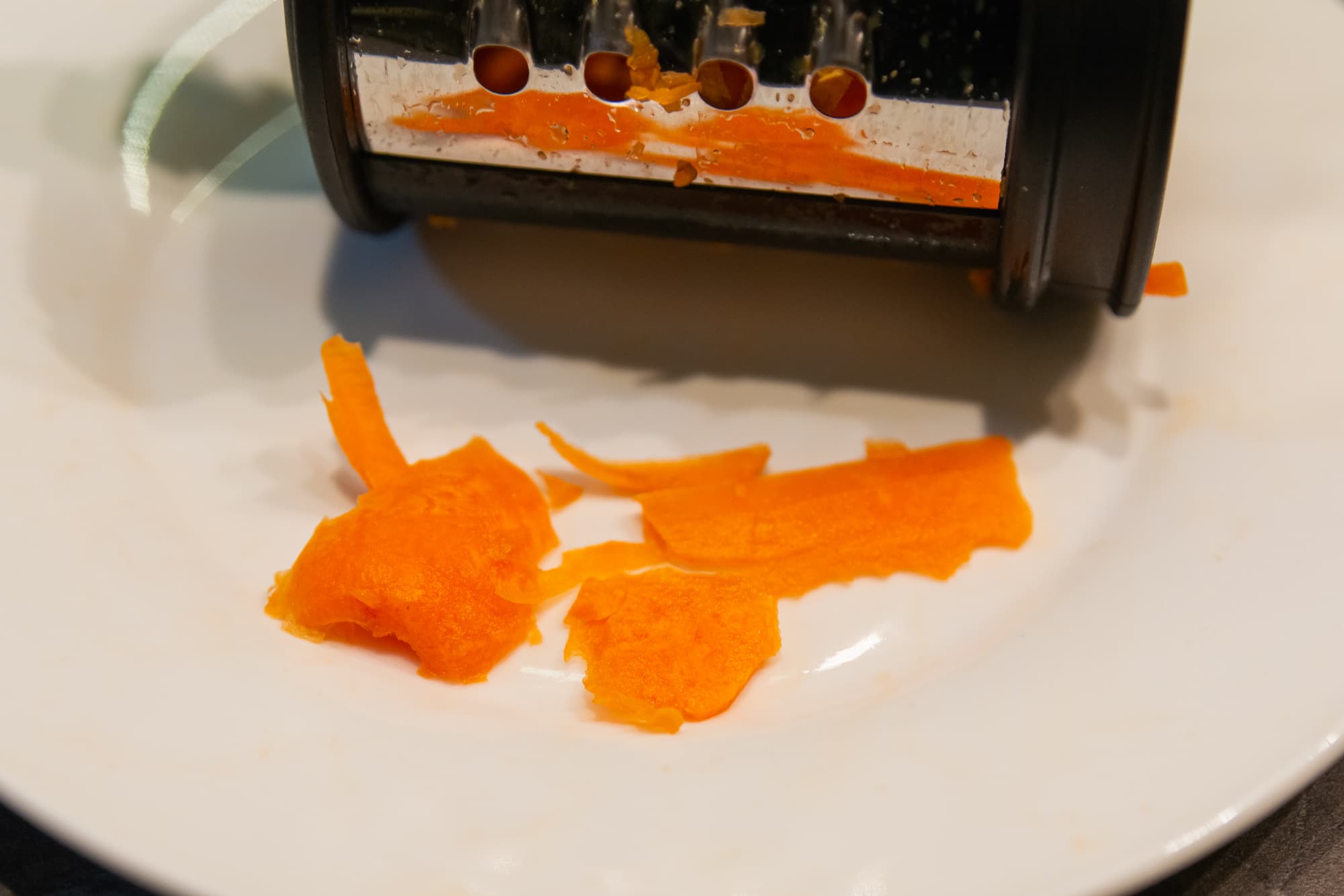 Крупную терку мы опробовали также на моркови. Овощ весом 95 г прибор измельчил в красивую ровную стружку за 22 секунды.