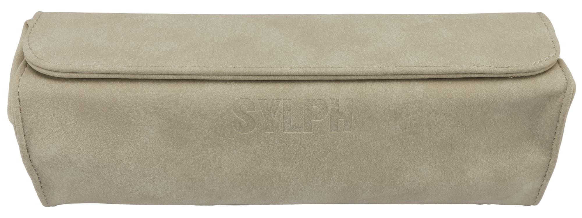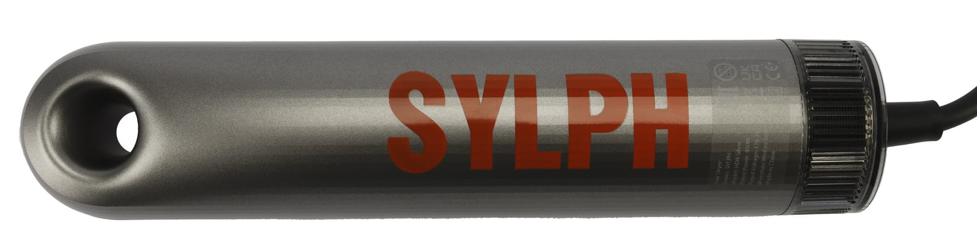 На тыльной стороне фена краской нанесена крупная оранжевая надпись Sylph, а рядом — едва заметная наклейка с краткими техническими характеристики прибора и информацией о производителе.