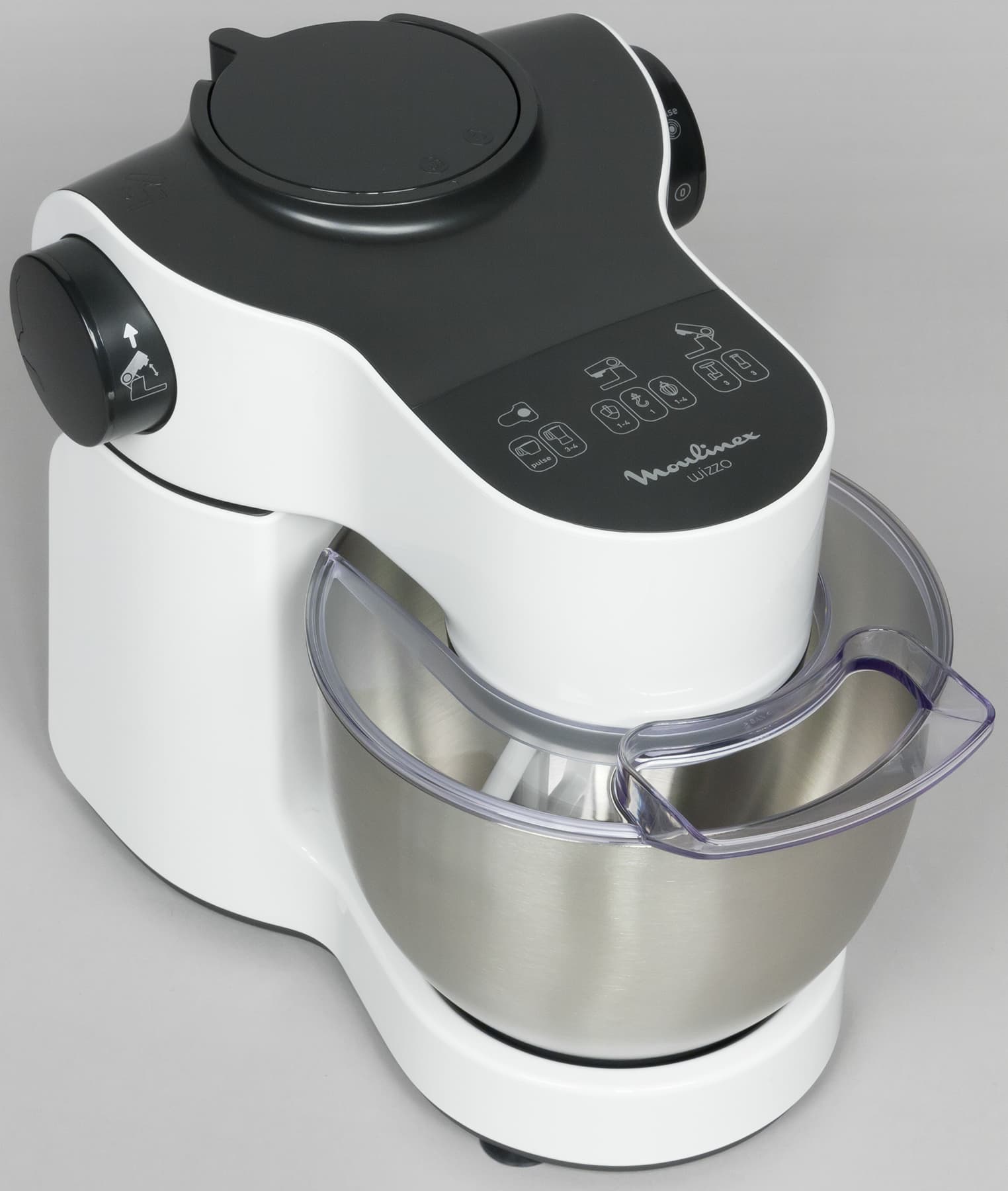 Moulinex Wizzo QA3001 позиционируется производителем как «кухонная машина». Впрочем, конструктивных отличий от обычного миксера тут практически нет. Судя по всему, дело в том, что к прибору можно докупить дополнительные аксессуары, позволяющие использовать его в качестве стационарного блендера и мини-измельчителя (они устанавливаются в гнездо на крышке), а также насадку-терку и насадку-мясорубку (их подключают к переднему гнезду на опускающемся плече).