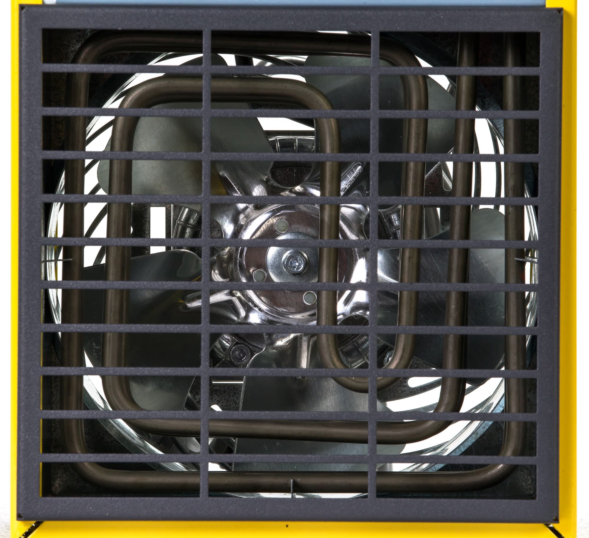 Снизу у пушки находятся резиновые ножки, на задней стенке закреплен вентилятор, спереди можно увидеть защитную решетку и две вращающиеся ручки управления. Через решетку хорошо видны лопасти вентилятора и нагревающий элемент (спираль). Сверху предусмотрено крепление для ручки (поставляется в комплекте с обогревателем).